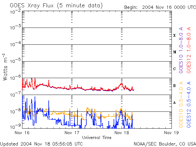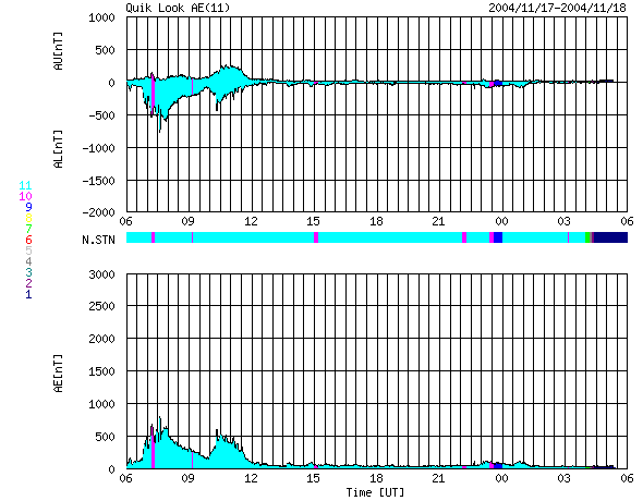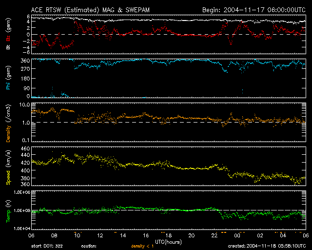 2004/11/18 14:59 更新 太陽、磁気圏ともに穏やかです。今後コロナホールによる乱れが発生しそうです。 担当 篠原 太陽風の速度は400km/秒台を切り、370km/秒まで緩やかに低下しています。 太陽風の磁場強度は5nTと通常のレベルを保っており、 その南北成分は時々ですが、大きく変化しています。 このため、南向きが強まった時にオーロラ活動が活発になっていた様です。 AE指数を見ると、17日15〜21時(世界時17日6〜12時)に、 500nT程度のオーロラの活動が観測されています。 その後は太陽風磁場の南向き成分がほとんど見られないため、磁気圏は穏やかです。 太陽風の速度が下がり続けているため、今後も穏やかな状態が続くでしょう。 SOHO EIT284カメラでは、コロナホール(中心やや右上に暗く見えている領域)が更に西へ移動しています。 ここから吹き出していた高速風が、20日頃に地球に届きそうです。 早ければ明日の午後から影響が現れるかもしれません。 磁場強度が強まって南向きに振れると、オーロラ活動が活発になると予想されます。 影響は2日程度と見込まれます。 太陽のフレア(太陽爆発)活動はとても穏やかです。 唯一やや活動的だった700群も西の縁(右端)に沈もうとしています。 SOHO EIT284カメラの太陽画像を見ると、東側(左側)がかなり明るくなっています。 ここから新しい黒点群が上って来るかもしれません。 SOHO衛星のEIT284カメラの映像 (c) SOHO (ESA & NASA)