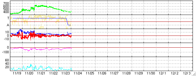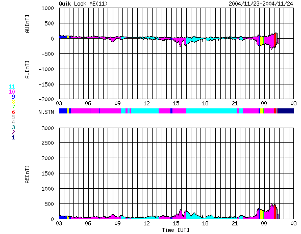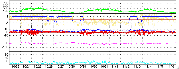 ACEが観測した太陽風の磁場(1番上の枠、白線は全体の強度、赤線は南北成分) および、太陽風の密度(3番目の橙線)、速度(4番目の黄線) (c) NOAA/SEC ![]() リアルタイムAE指数 下段のAEグラフの値が高くなると、オーロラ活動が活発化しています。 (c) 京都大学, NICT ![]() 27日の太陽周期に合わせたデータプロット (太陽風版) 太陽が同じ面を地球に向けていた27日前の変化から、今後を予想することができます。 (c) NICT
