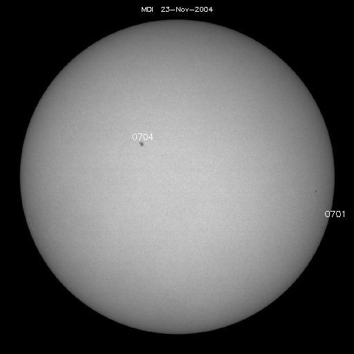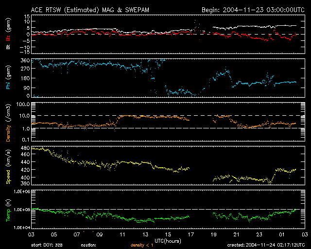 2004/11/24 11:18 更新 太陽風の速度は順調に低下しています。磁気圏は概ね静穏です。 担当 篠原 太陽風の速度は引き続き低下を続けて、ほぼ400km/秒の通常レベルに戻りました。 磁場強度は5nT前後で、こちらも普通の強度範囲です。 太陽風の最新の部分で、速度と磁場に変化が見られていますが、 短期間の変化で終わると思われます。 現在の磁気圏は静穏で、オーロラ活動はほとんど見られません。 最新の部分で、太陽風の乱れに対応する形でAE指数に小さな乱れが観測されています。 ここ数日お知らせしてきましたが、明日くらいからコロナホールの影響が始まると思われます。 SOHO EIT284カメラの太陽画像、中心から右下よりの部分に薄暗くコロナホールが見えています。 コロナホールは太陽の磁場が外部に開いている部分に見えます。 磁場が開いているため、そこから高速のプラズマが流れ出し、速度の速い太陽風を産むのです。 今後の変化は、27日周期の図の10月29日以降の変化を参考にして下さい。 磁場強度の強まり、速度の上昇が起こり、オーロラ活動が活発化されます。 太陽面では、701、704の2つの黒点群が見えていますが、どちらも穏やかです。 SOHO EIT284カメラの太陽画像では、東の端(左端)のやや下寄りに明るい部分が見えています。 ここから活動的な領域が上って来そうです。 昨日から今日にかけて、C2.3、C6.5の2つの小規模フレア(太陽爆発)が発生していますが、 これらはこの東端の領域が起こしたフレアです。 この活動的な領域はやがてこちら側に回って来るはずですので、注目です。 SOHO衛星のEIT284カメラの映像 (c) SOHO (ESA & NASA)