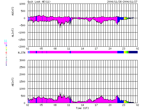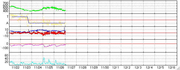 ACEが観測した太陽風の磁場(1番上の枠、白線は全体の強度、赤線は南北成分) および、太陽風の密度(3番目の橙線)、速度(4番目の黄線) (c) NOAA/SEC ![]() リアルタイムAE指数 下段のAEグラフの値が高くなると、オーロラ活動が活発化しています。 (c) 京都大学, NICT ![]() 27日の太陽周期に合わせたデータプロット (太陽風版) 太陽が同じ面を地球に向けていた27日前の変化から、今後を予想することができます。 (c) NICT