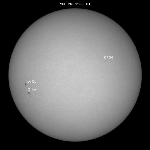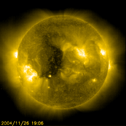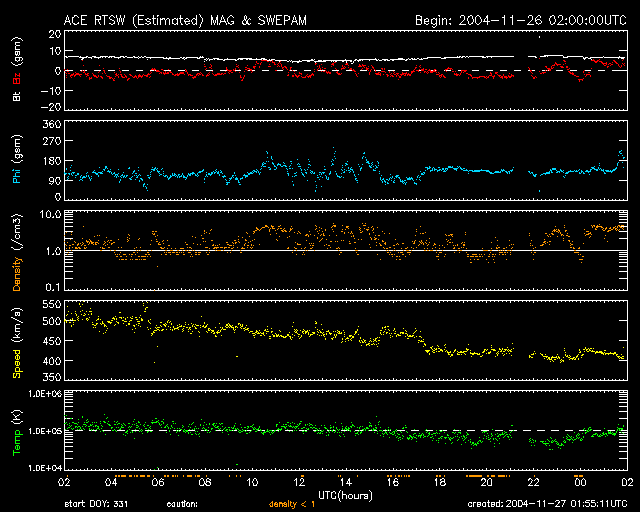 2004/11/27 10:56 更新 太陽風の速度は下がりました。磁気圏は3日程度穏やかになりそうです。 担当 篠原 コロナホールの影響から抜け、太陽風の速度は緩やかに低下を続けています。 現在は400km/秒の通常レベルに下がっています。 磁場強度は7nTとやや強めにあり、しかも、南向きが頻繁に現れています。 このため、弱いオーロラ活動が連続的に現れていた様です。 AE指数を見ると500nT弱の活動が続いています。 太陽風の速度が下がりきってしまったので、今後は穏やかに変化して行くと思われます。 磁場強度も次第に下がって行くでしょう。 次のコロナホールの右端が太陽の中心部に達しました。 ここから吹き出している速度の速い太陽風が、これから3〜4日かけて地球へやって来ます。 11月30日か12月1日頃に影響が現れ始めると予想されます。 太陽風の磁場強度が強まり、速度が上がります。 磁場の南向きが強まると、オーロラ活動が活発になるでしょう。 太陽面では、706、707の2つの黒点群がきれいに並んで見えています。 今の所、目立ったフレア活動は見られていませんが、この両群は発達の傾向も見せています。 Cクラスの小規模フレアを起こす可能性があるそうです。 SOHO衛星のEIT284カメラの映像 (c) SOHO (ESA & NASA)