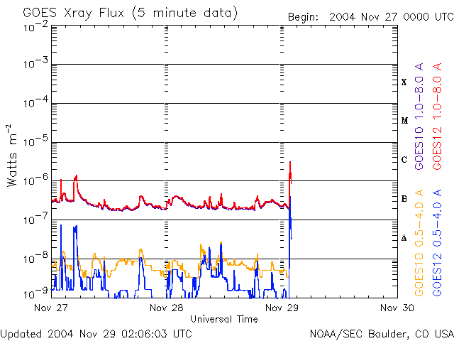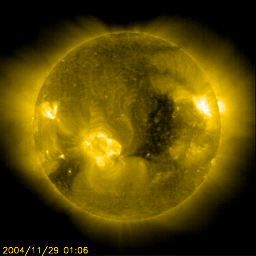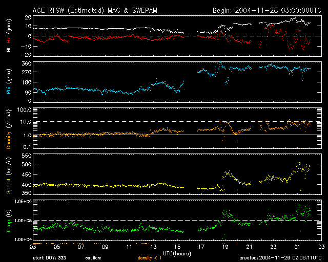 2004/11/29 11:06 更新 太陽風に乱れが現れています。コロナホールの影響かもしれません。オーロラが活発になりそうです。 担当 篠原 29日3時(世界時28日18時)頃から、 太陽風の速度上昇と、磁場強度の強まりが、ほとんど同時に始まりました。 太陽風の速度は400km/秒から500km/秒へ上がり、磁場は5nTから10〜15nTへ強まっています。 しかも、オーロラ活動のスイッチともいえる太陽風磁場の南北成分が、 南向き成分を強く持っています(ACEの1列め赤線がマイナスに振れている)。 このため、これからオーロラ活動が活発化すると予想されます。 AE指数の変化や、アラスカのライブカメラなどに注目して下さい。 これは、先日からお知らせしていたコロナホールの影響が地球へ及び始めたためかもしれません。 コロナホールの位置関係から考えると、まだ1日程度早そうに思われるのですが、 コロナホールがある程度の規模を持っているので、高速風領域も広がっていたのかもしれません。 コロナホールの影響は3〜4日くらい続くのではないでしょうか。 オーロラの活発化と共に、弱い磁気嵐の発達も考えられます。 今後の太陽風の変化に注意して下さい。 太陽のフレア(太陽爆発)活動は概ね静穏です。 黒点群も規模の大きな群は見られません。 ちょうど最新のデータで、Cクラスの小規模フレアが発生した様ですが、 フレア活動としてはこの程度と思われます。 SOHO衛星のEIT284カメラの映像 (c) SOHO (ESA & NASA)