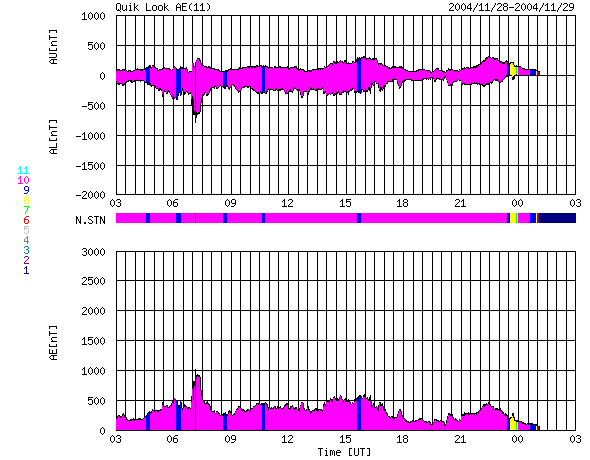 ACEが観測した太陽風の磁場(1番上の枠、白線は全体の強度、赤線は南北成分) および、太陽風の密度(3番目の橙線)、速度(4番目の黄線) (c) NOAA/SEC ![]() リアルタイムAE指数 下段のAEグラフの値が高くなると、オーロラ活動が活発化しています。 (c) 京都大学, NICT ![]() SOHO衛星のMDIカメラによる太陽黒点 (c) SOHO (ESA & NASA) ![]() GOES衛星の太陽X線データ (c) NOAA/SEC ![]() | ||||||||||||||||||||||||||||||||||||||||