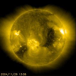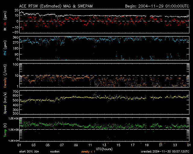 2004/11/30 09:58 更新 太陽風が高速になっています(550km/秒)。これまでのところオーロラはあまり活発ではありません。 担当 篠原 現在、地球はコロナホールの影響下にあります。 SOHO EIT284カメラの太陽画像をご覧下さい。 太陽面中心からやや西寄り(右寄り)に黒く穴の様な構造が見えています。 (南東(左下)にももうひとつ別の穴が見えています) これはコロナホールと呼ばれ、太陽の磁場が宇宙空間に向かって開いている場所です。 ここからは噴水の様に、速度の速い太陽風が吹き出しています。 ちょうど今写真に見えている辺りにコロナホールが来た時に、地球がこの高速風に当たります。 現在の太陽風の速度は550km/秒で、高速のまま安定しています。 磁場強度も10nTと強い状態が続いています。また、南北成分(赤線)は頻繁に変化を示しています。 通常この程度に南北成分が乱れると、地球磁気圏のオーロラ活動も活発になるものなのですが、 これまでのところ、AE指数を見るとあまり目立ったオーロラ活動は発生していない様です。 理由は良く分かりませんが、現状が高速であることと磁場強度も強いことから、 引き続きオーロラ活動が活発になる可能性が高いと考えられます。 高速風は2〜3日は続くと思われます。 太陽黒点は3つの群が目立って見えています。 規模は大きいものではなく、目立った成長もしていません。 フレア(太陽爆発)活動は穏やかで、Cクラスの小規模フレアが発生する程度の様です。 SOHO衛星のEIT284カメラの映像 (c) SOHO (ESA & NASA)