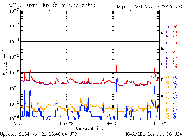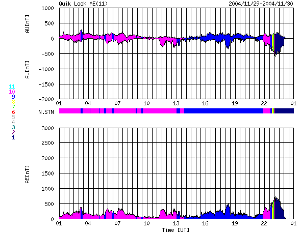 ACEが観測した太陽風の磁場(1番上の枠、白線は全体の強度、赤線は南北成分) および、太陽風の密度(3番目の橙線)、速度(4番目の黄線) (c) NOAA/SEC ![]() リアルタイムAE指数 下段のAEグラフの値が高くなると、オーロラ活動が活発化しています。 (c) 京都大学, NICT ![]() SOHO衛星のMDIカメラによる太陽黒点 (c) SOHO (ESA & NASA) ![]() GOES衛星の太陽X線データ (c) NOAA/SEC ![]() | ||||||||||||||||||||||||||||||||||||||||