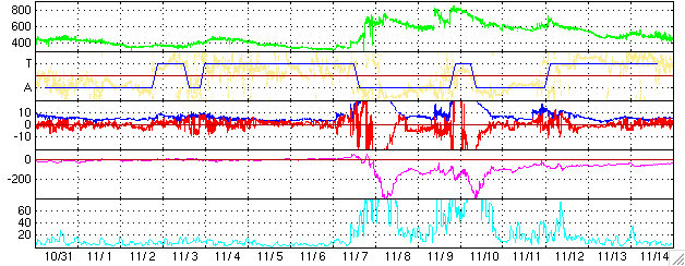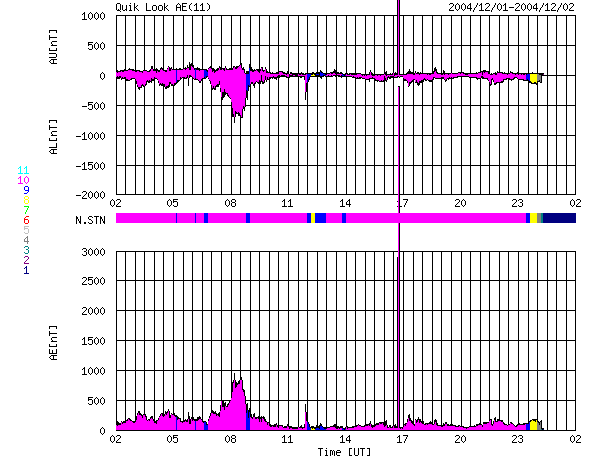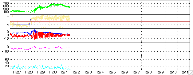 ACEが観測した太陽風の磁場(1番上の枠、白線は全体の強度、赤線は南北成分) および、太陽風の密度(3番目の橙線)、速度(4番目の黄線) (c) NOAA/SEC ![]() リアルタイムAE指数 下段のAEグラフの値が高くなると、オーロラ活動が活発化しています。 (c) 京都大学, NICT ![]() 27日の太陽周期に合わせたデータプロット (太陽風版) 太陽が同じ面を地球に向けていた27日前の変化から、今後を予想することができます。 (c) NICT