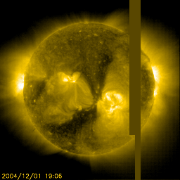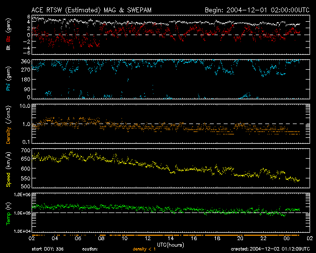 2004/12/ 2 10:12 更新 太陽風速度はピークを越え、低下を始めています。磁気圏は穏やかです。 担当 篠原 地球は高速太陽風の領域から抜け始めています。 650km/秒だった太陽風は、1日18時(世界時1日9時)頃から速度の緩やかな低下が始まり、 現在は550km/秒まで下がりました。 磁場強度も引き続き弱まる傾向を見せており、5nTから3nTまで下がっています。 現在の磁気圏は穏やかで、オーロラ活動を示すAE指数では、 1日17時(世界時1日8時)頃に短期的なオーロラ活動が観測されていますが、 その他は小さな変動しかありません。 太陽風は引き続いて速度の低下を続けて行くでしょう。 27日周期の図を見ると、この3日間の太陽風の変化が良く分かります。 速度(緑線)と磁場強度(青線)のグラフに注目して下さい。 一方、新しいコロナホールが太陽面の中央線に達しています。 SOHO EIT284の太陽画像をご覧下さい。 南北(縦方向)に細長く、そして南側で広くコロナホールが見えています(黒く見えている領域です)。 続いてこの領域の影響による太陽風速度の上昇が、5日くらいから始まると予想されます。 GOES衛星の観測によると、放射線帯の高エネルギー電子の密度が増加傾向にあります。 これから図の赤線と青線が、警戒ラインといわれる10の4乗の線に達すると思われます。 衛星の運用などでは今後注意が必要になりそうです。 太陽面では707群と708群がやや活発なフレア(太陽爆発)活動を起こしています。 708群がM1.2の中規模フレアを、707群はCクラスの小規模フレアを5回起こしています。 これからも、小・中規模のフレアを起こす可能性がある様です。 SOHO衛星のEIT284カメラの映像 (c) SOHO (ESA & NASA)