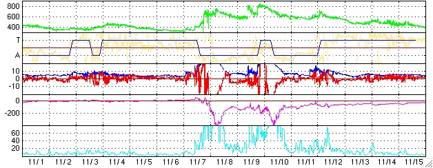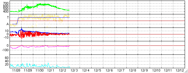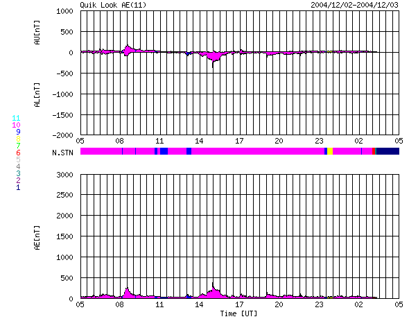 ACEが観測した太陽風の磁場(1番上の枠、白線は全体の強度、赤線は南北成分) および、太陽風の密度(3番目の橙線)、速度(4番目の黄線) (c) NOAA/SEC ![]() リアルタイムAE指数 下段のAEグラフの値が高くなると、オーロラ活動が活発化しています。 (c) 京都大学, NICT ![]() 27日の太陽周期に合わせたデータプロット (太陽風版) 太陽が同じ面を地球に向けていた27日前の変化から、今後を予想することができます。 (c) NICT