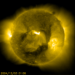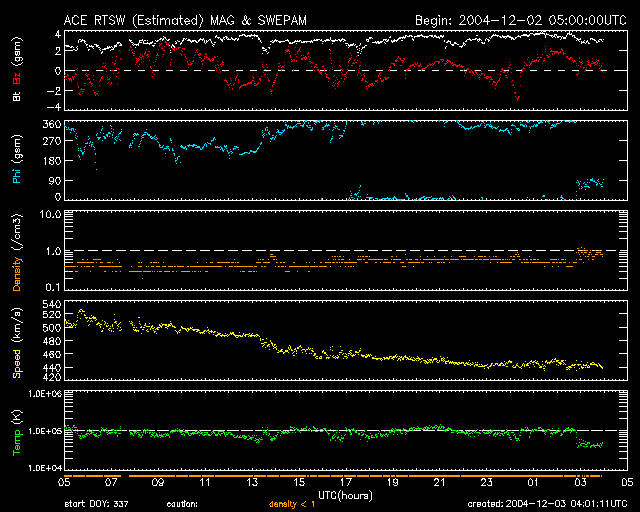 2004/12/ 3 13:01 更新 太陽風の速度は低下しており、磁気圏は静穏です。続いて、新しい擾乱が始まりそうです。 担当 篠原 コロナホールの影響を抜けて、太陽風の速度は通常レベルの420km/秒に下がっています。 磁場強度も3nT程度と弱く、磁気圏はとても穏やかです。 一方、新たな擾乱要因がいくつか見込まれています。 ひとつめは、次のコロナホールです。 SOHO EIT284カメラの太陽画像では、黒いコロナホールが太陽の中心を過ぎ、 西側(右側)へ進んでいる様子を見る事ができます。 ここから吹き出している高速太陽風の影響が、明後日の5日頃から始まりそうです。 またもうひとつは、不確定な面がありますが、 フレアに伴って観測されたCME(太陽ガスの放出現象)による擾乱です。 1日16時(世界時1日7時)にM1.2の中規模フレアが発生しました。 このフレアに続いてSOHO LASCO C3カメラではCMEが観測されています (SOHO LASCO C3の太陽画像の左側2枚)。 この影響が地球に及ぶとすると、今夜から明日にかけて太陽風の速度の急な上昇が発生するかもしれません。 そして、今日、3日9時(世界時3日0時)に発生したM1.6の中規模フレアによるCMEです (SOHO LASCO C3の太陽画像の右側2枚)。 こちらは明後日、5日の午後以降に地球へ到達する可能性があります。 コロナホールの影響はほぼ間違いなく地球へ及ぶと思われます。 これから数日間は太陽風の変化に注意して下さい。 オーロラが急に活発になったり、磁気嵐が発生する可能性があります。 CMEに関連して書きましたが、今朝の3日9時(世界時3日0時)にM1.6の中規模フレアが発生しています。 発生場所は708黒点群です。ここは一昨日にもM1.2のフレアを起こしています。 黒点としてはたいした規模を持っている様に見えませんが、活発に活動している領域の様です。 昨日、GOES衛星で観測される高エネルギー電子が増加するかもしれないとお知らせしていましたが、 今の所、目立った増加は観測されていません。 変化の様子から、今回はこれ以上の上昇はなさそうに思います。 SOHO衛星のEIT284カメラの映像 (c) SOHO (ESA & NASA)