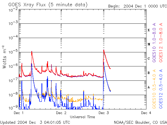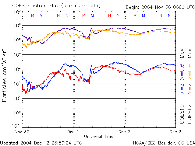 (c) SOHO (ESA & NASA) ![]() GOES衛星の太陽X線データ (c) NOAA/SEC ![]() GOES衛星による、静止衛星軌道における高エネルギー電子の変化 (c) NOAA/SEC ![]() | ||||||||||||||||||||||||||||||||||||||||||||||||||||||||||||
