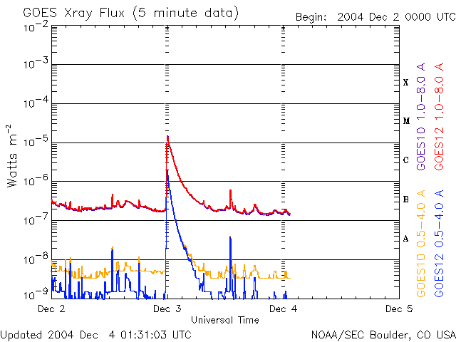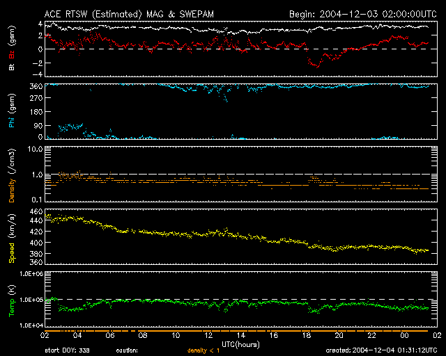 2004/12/ 4 10:32 更新 太陽風は通常レベルで、磁気圏は穏やかです。明日以降の擾乱が予想されます。 担当 篠原 太陽風は速度が緩やかに下がり続け、現在はやや低めの380km/秒になっています。 磁場強度も3nTと弱く、磁気圏はとても穏やかです。 オーロラの活動を示すAE指数のグラフには、ほとんど変化が見られません。 太陽風は今日一日程度このまま穏やかで、磁気圏も静かな状態が続くでしょう。 明日以降、太陽風の乱れが予想されます。 昨日のニュースでもお知らせしましたが、コロナホールの影響が始まります。 SOHO EIT284カメラの画像をご覧下さい。 輪の様にも見える黒い影が、太陽の自転に伴って西側(右側)に移動しています。 そろそろ地球に影響が及ぶ目安の位置に達します。 また、3日9時(世界時3日0時)に発生したM1.6の中規模フレアによるCMEの衝撃波が、 明日の午後以降地球に達すると予想されます。 (SOHO LASCO C3の太陽画像参照) 太陽風の速度が急に上昇し、オーロラが活発になったり、磁気嵐が発生するかもしれません。 太陽のフレア(太陽爆発)活動は、M1.6のフレア以降穏やかになっています。 しかし、707、708の黒点群は今後も小、中規模のフレアを起こす可能性があります。 SOHO衛星のEIT284カメラの映像 (c) SOHO (ESA & NASA)