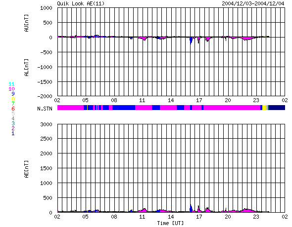 ACEが観測した太陽風の磁場(1番上の枠、白線は全体の強度、赤線は南北成分) および、太陽風の密度(3番目の橙線)、速度(4番目の黄線) (c) NOAA/SEC ![]() リアルタイムAE指数 下段のAEグラフの値が高くなると、オーロラ活動が活発化しています。 (c) 京都大学, NICT ![]() SOHO衛星のMDIカメラによる太陽黒点 (c) SOHO (ESA & NASA) ![]() GOES衛星の太陽X線データ (c) NOAA/SEC ![]() | ||||||||||||||||||||||||||||||||||||||||||||