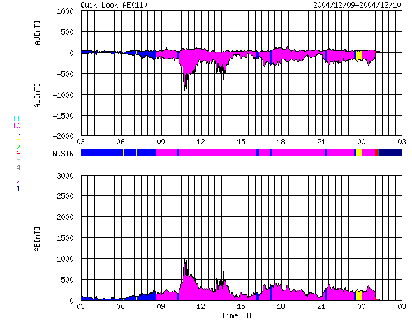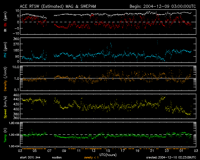 ACEが観測した太陽風の磁場(1番上の枠、白線は全体の強度、赤線は南北成分) および、太陽風の密度(3番目の橙線)、速度(4番目の黄線) (c) NOAA/SEC ![]() リアルタイムAE指数 下段のAEグラフの値が高くなると、オーロラ活動が活発化しています。 (c) 京都大学, NICT ![]() GOES衛星による、静止衛星軌道における高エネルギー電子の変化 (c) NOAA/SEC ![]() SOHO衛星のMDIカメラによる太陽黒点 (c) SOHO (ESA & NASA) ![]() GOES衛星の太陽X線データ (c) NOAA/SEC ![]() | ||||||||||||||||||||||||||||||||||||||||||