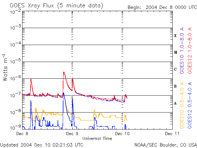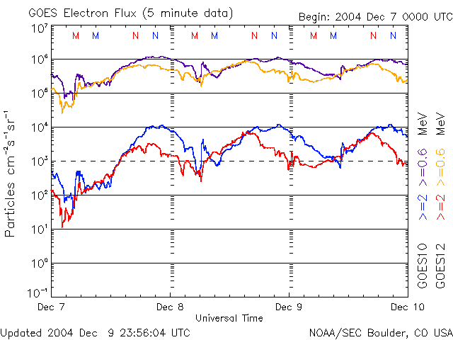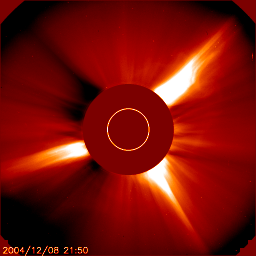 2004/12/10 11:24 更新 太陽風速度は下がりましたが、南向き磁場の影響でオーロラはやや活発です。明日から擾乱が始まる可能性があります。 担当 篠原 ACE衛星の観測によると、太陽風の速度は引き続き低下を続け、 現在は400km/秒と通常の速度に戻っています。 磁場強度は5nTと、こちらも普通の強さなのですが、 南向き成分(1列めの赤線がマイナスに振れている)が連続的に現れています。 このため、あまり大きなものではありませんが、オーロラ活動が続いている様です。 AE指数のグラフを見ると、500nT弱の弱い活動が連続的に観測されています。 中には、一時的ですが1000nTに達する強いオーロラ活動もあった様です。 太陽風磁場の南寄りの傾向が続く間は、現在の様な小規模のオーロラ活動が続くと思われます。 速度が下がっていますので、大きな変動は期待できません。 昨日もお知らせしましたが、 9日5時半(世界時8日19時半)に709黒点群がC2.5の小規模フレアを起こしました。 これに伴って、CME(太陽ガスの放出現象)が発生した様です。 SOHOの太陽観測が休止の時期に入ったのか、太陽画像の更新が停止しています。 9日に更新された最後の画像から、太陽ガスの放出の様子をご紹介したいと思いますが、 動画ではないので、残念ながら非常に分かりにくいです。 右上に伸びる明るい光の筋に、こぶの様なものが飛び出しているのがかすかに見えています。 この放出による高速の太陽風が明日の午後以降に地球に到達する可能性があります。 太陽風の速度や磁場強度が急に上昇し、オーロラを活発にしたり、 磁気嵐を発生させる可能性があります。 明日の太陽風データの変化に注意して下さい。 放射線帯の高エネルギー電子の密度は、ピークは越えた様です。 しかし、依然高いレベルを保っていますので、まだしばらく注意が必要でしょう。 太陽黒点の画像は8日の古い画像です。 710黒点群の番号が振られていますので、掲載しています。 この710群がC1のとても小さな小規模フレアを発生させています。 SOHO衛星のLASCO C2カメラの映像 (c) SOHO (ESA & NASA)