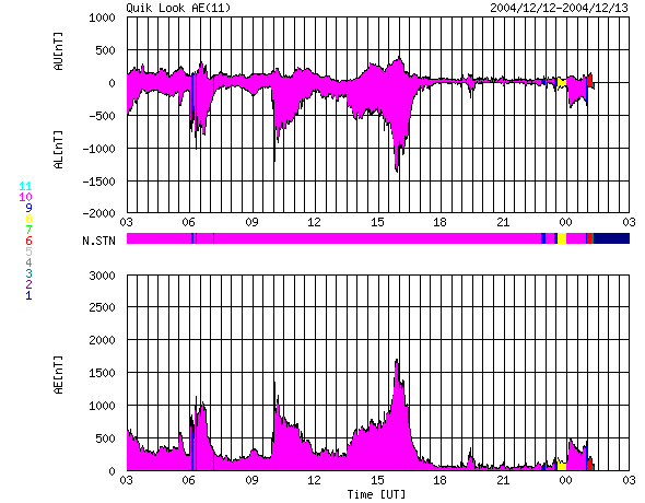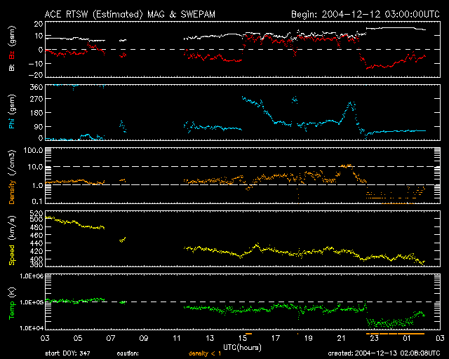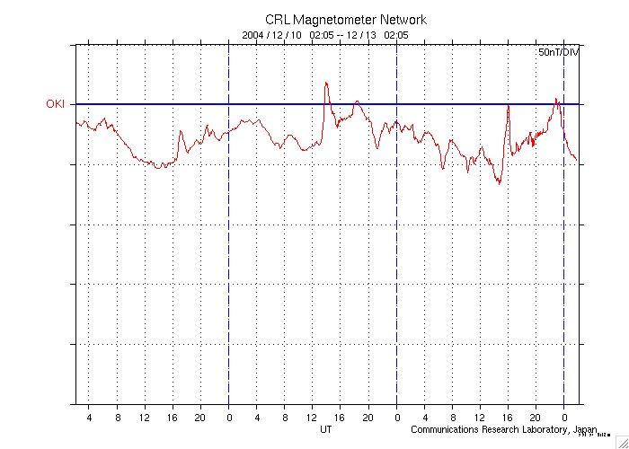 2004/12/13 11:06 更新 高速風の影響は終わりましたが、太陽風磁場が大変強く南を向いています。 担当 篠原 太陽風の磁場が大きく南を向きました。 13日7時(世界時12日22時)に太陽風の磁場が急に南向きに変わり、 -15nTに達する強い南向きが観測されました。 現在は-5nT程度まで弱まって来ましたが、既に4時間に渡って強い南向きが続いています。 この影響で、オーロラが活発化していると考えられます。 高速だった太陽風の速度は既に400km/秒に下がっていますので、大きな乱れにはなりませんが、 弱い磁気嵐状態には発達するかもしれません。 沖縄の磁場データを見ると、50nT程度の急な磁場減少が観測されています。 南向き成分は緩やかに弱まっていますので、擾乱は比較的短期間のうちに治まって行くでしょう。 また、昨日は太陽風の速度は500km/秒から低下を続けていましたが、 太陽風磁場が南向きをとる時間帯が長かったために、オーロラ活動がかなり活発になっていました。 AE指数のグラフを見ると、1000nTを越える激しい変動が幾度も観測されています。 極域ではかなり激しいオーロラを見る事ができたのではないでしょうか。 太陽のフレア(太陽爆発)活動は穏やかです。 目立った黒点も無く、静かな太陽写真になっています。 ACEが観測した太陽風の磁場(1番上の枠、白線は全体の強度、赤線は南北成分) および、太陽風の密度(3番目の橙線)、速度(4番目の黄線) (c) NOAA/SEC ![]() 沖縄の磁場擾乱 下へ下がるほど、擾乱が発達している事を意味します。 (c) NICT ![]() リアルタイムAE指数 下段のAEグラフの値が高くなると、オーロラ活動が活発化しています。 (c) 京都大学, NICT ![]() GOES衛星の太陽X線データ (c) NOAA/SEC ![]() SOHO衛星のMDIカメラによる太陽黒点 (c) SOHO (ESA & NASA) ![]() | |||||||||||||||||||||||||||||||||||||||