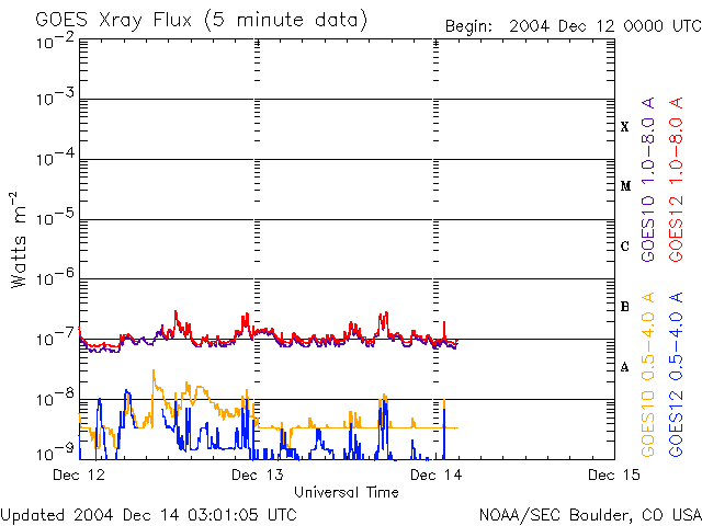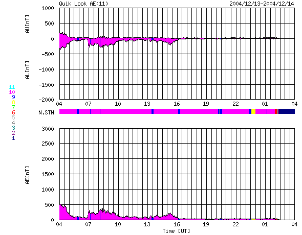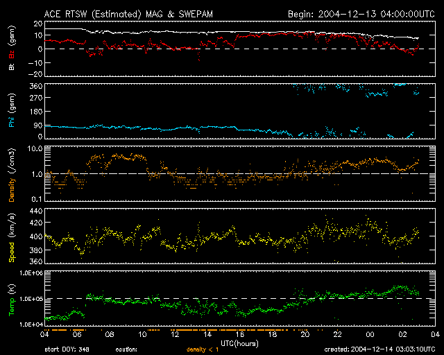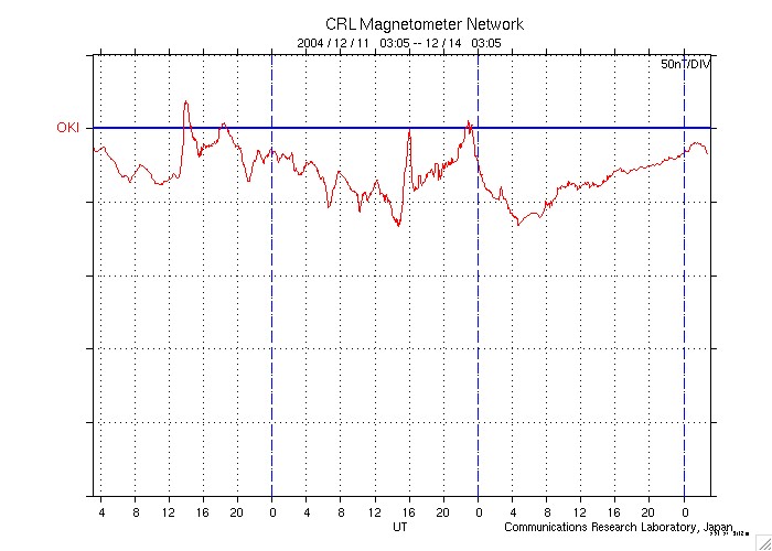 2004/12/14 12:01 更新 太陽風の磁場強度は強い状態です。北向きのため、オーロラ活動は収まっています。 担当 篠原 太陽風磁場の強度は現在も強い状態が続いています。 昨日15nTにまで強まっていた磁場強度は、次第に下がってきましたが、現在も9nT程度あります。 磁気圏擾乱に繋がる、磁場の南北成分(ACEデータの赤線)は、 昨日のニュース以降は北寄りに切り替わりました。 このためオーロラ活動は低下し、AE指数も静穏になっています。 一方、沖縄の磁場データを見ると、 13日14時(世界時13日5時)頃に、地上磁場強度が静穏レベル(青い横線)から約-60nT下がっています。 強い南向き磁場の影響で、弱い磁気嵐状態になっていた様です。 太陽風の最新データを見ると、磁場の南北成分が、 北寄りから次第に下がって南寄りに変わりつつある様に見えます。 この後、本格的に南向きに切り替わるかもしれません。 速度が下がっているため大規模にはなりませんが、オーロラ活動が活発になる可能性があります。 もうしばらく太陽風への注意が必要です。 SOHO衛星のEIT284カメラがメンテナンス中のため、最新画像がありません。 過去のデータを参考にすると、これから2日程度は静穏な状態が続きそうです。 その後、コロナホールの影響が始まると予想されます。 太陽のフレア(太陽爆発)活動は穏やかです。 黒点も西に没しつつある711群しか見られません。 GOES衛星のX線レベルも、Aクラスに下がりつつあります。 ACEが観測した太陽風の磁場(1番上の枠、白線は全体の強度、赤線は南北成分) および、太陽風の密度(3番目の橙線)、速度(4番目の黄線) (c) NOAA/SEC ![]() リアルタイムAE指数 下段のAEグラフの値が高くなると、オーロラ活動が活発化しています。 (c) 京都大学, NICT ![]() 沖縄の磁場擾乱 下へ下がるほど、擾乱が発達している事を意味します。 (c) NICT ![]() SOHO衛星のMDIカメラによる太陽黒点 (c) SOHO (ESA & NASA) ![]() GOES衛星の太陽X線データ (c) NOAA/SEC ![]() | |||||||||||||||||||||||||||||||||||||||