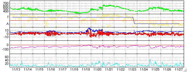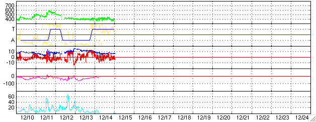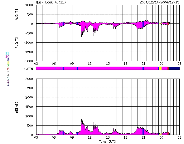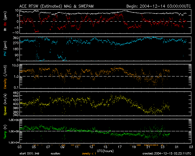 2004/12/15 11:21 更新 太陽風磁場が乱れており、オーロラがやや活発になっています。また、明日から高速太陽風が始まりそうです。 担当 篠原 ACE衛星の太陽風観測によると、太陽風磁場が8nT前後と比較的強い状態が続いています。 しかも、南北成分(ACEの1列目赤線)が大きく南北(マイナス・プラス)に変動していて、 この影響で磁気圏ではオーロラ活動がやや活発になっています。 AE指数のグラフを見ると、500nT前後の活動が数度に渡って観測されています。 ただし、太陽風の速度は400km/秒と通常レベルでしたので、この程度のオーロラ活動にとどまった様です。 太陽風の磁場は次第に弱まる傾向を見せていますが、現在も7nT程度あります。 南寄りの傾向も続いていますが、太陽風速度が360km/秒に下がってしまいましたので、 これからのオーロラ活動はより小規模になるでしょう。 一方、コロナホールによる高速太陽風の領域が地球に近づいています。 SOHO衛星の観測が休止していますので、太陽の最新画像がありませんが、 27日前の太陽の同じ面が地球を向いていた頃のデータを参照することにします。 27日周期の図をご覧下さい。 上の段は27日前に地球に届いていた太陽風の変化や、磁気圏擾乱の程度を示しています。 この中の緑色の線(太陽風の速度)を見ると、11月19日(世界時)から上昇して最大600km/秒に達しています。 これと同様の変化が12月16日(世界時)頃から始まりそうです。 速度の上昇に先立って、磁場強度(青線)の強まりが観測されていることにも注目して下さい。 明日、12月16日の夜以降に太陽風の変化が始まると予想されます。 太陽風磁場の強まりが見られ、やがて速度が上昇し始めるでしょう。 オーロラ活動が活発になったり、磁気嵐が発生する可能性があります。 太陽面では黒点がほとんど見えなくなっています。 唯一の711群も、まもなく西の端に沈む所です。 フレア(太陽爆発)活動もおだやかで、目立った現象は観測されていません。 しばらく穏やかな日が続きそうです。 ACEが観測した太陽風の磁場(1番上の枠、白線は全体の強度、赤線は南北成分) および、太陽風の密度(3番目の橙線)、速度(4番目の黄線) (c) NOAA/SEC ![]() リアルタイムAE指数 下段のAEグラフの値が高くなると、オーロラ活動が活発化しています。 (c) 京都大学, NICT ![]() 27日の太陽周期に合わせたデータプロット (太陽風版) 太陽が同じ面を地球に向けていた27日前の変化から、今後を予想することができます。 (c) NICT