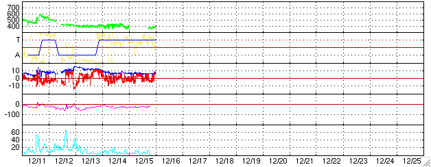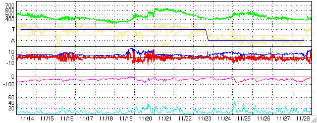 ACEが観測した太陽風の磁場(1番上の枠、白線は全体の強度、赤線は南北成分) および、太陽風の密度(3番目の橙線)、速度(4番目の黄線) (c) NOAA/SEC ![]() リアルタイムAE指数 下段のAEグラフの値が高くなると、オーロラ活動が活発化しています。 (c) 京都大学, NICT ![]() 27日の太陽周期に合わせたデータプロット (太陽風版) 太陽が同じ面を地球に向けていた27日前の変化から、今後を予想することができます。 (c) NICT