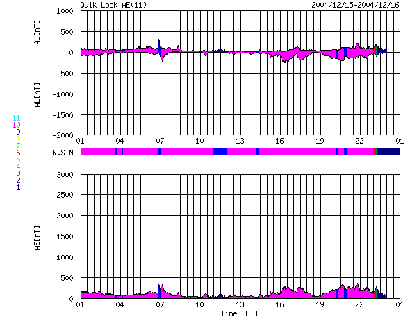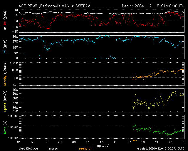 2004/12/16 09:58 更新 太陽風磁場の強度はやや強く(7nT)、小規模のオーロラ活動に繋がっています。今後、太陽風速度の上昇が始まるでしょう。 担当 篠原 太陽風磁場の強度(ACEの1列目白線)は、依然やや強い状態が続いています。 昨日以降も7nT前後の安定した強度で推移しています。 南北成分(1列目の赤線)の変動も頻繁に発生しており、大きく南を向く(マイナスになる)時間帯もあります。 このため、オーロラ活動に刺激を与える状態が続いています。 これまでは太陽風速度が350km/秒前後と低速だったため、オーロラ活動は小規模なものに留まっています。 オーロラ活動の指標となるAE指数では、500nT以下の小さな変動しか観測されていません。 ただ、ACEデータの最新の部分では、太陽風の速度が400km/秒まで上がっており、 オーロラももう少し強まった活動になりそうです。 今夜からコロナホールによる高速太陽風の影響が始まりそうです。 SOHO EIT284の観測が休止しているために、現在の状況を見る事ができません。 その代わりとして、参考のために27日前のSOHO EIT284の画像を掲載します。 太陽面の西寄り(右寄り)から上に延びる様に、小さいですがやや暗く見えている部分があります。 ここがコロナホールです。 この穴の部分から、高速の太陽風が吹き出しています。 今夜頃から、まず太陽風磁場の強度が強まり始めると思われます。 それに続いて、速度の上昇が見られるでしょう。 速度上昇の前半部である、明日から明後日にかけてがオーロラ活動が活発になりやすい期間です。 高速太陽風は、前周期は600km/秒まで上がりました。3日間程度続きそうです。 太陽画像では、黒点群はほぼ見えなくなってしまいました。 711群もほぼ西に没しています。 GOES衛星のX線データも静穏で、このまま静かな状態が続くでしょう。 SOHO衛星のEIT284カメラの映像 (c) SOHO (ESA & NASA)