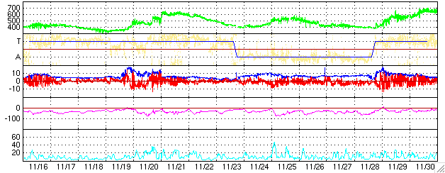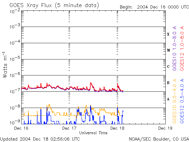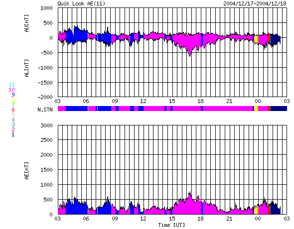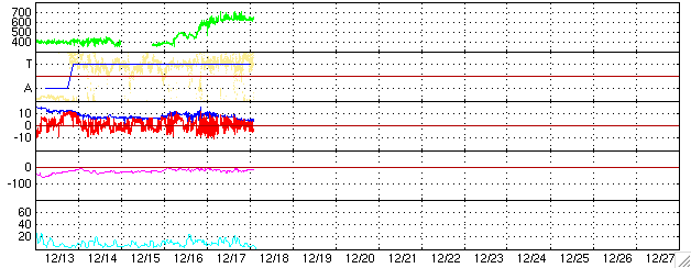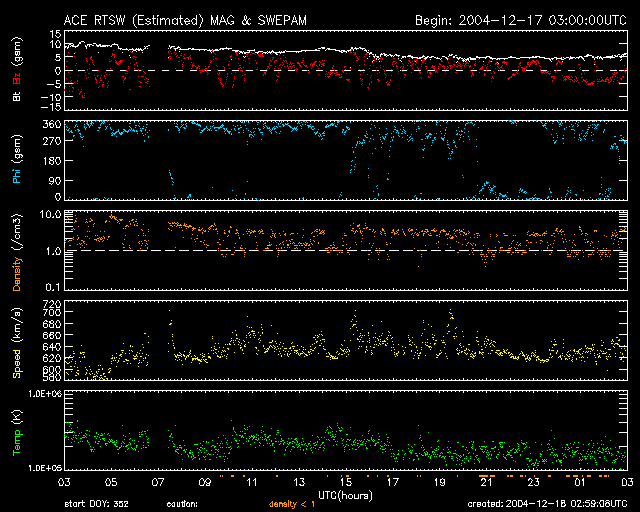 2004/12/18 11:59 更新 高速太陽風が続いています(620km/秒)。オーロラも活発に続いています。高速風はもう2日程度続きそうです。 担当 篠原 コロナホールによる太陽風の高速状態が継続しています。 速度は620〜650km/秒でほとんど安定しています。 磁場強度は10nTから緩やかに下がり、5nTになりました。 このことから、高速太陽風のピークは越えた様です。 オーロラ活動は、強いものではありませんが、 AE指数で500nT前後の活動が連続的に観測されています。 27日周期の図を参考にすると、11月20〜22日の太陽風速度(緑色線)の上昇に対応する様に、 12月17日の速度上昇が観測されていることが分かります。 このグラフの様子から、高速太陽風はもう2日程度、12月20日くらいまで続きそうです。 ACEデータの最新部分を見ると、磁場が南寄りに(赤線がマイナスに)強まっています。 これからオーロラが一段と活発化するかもしれません。 高速風が続いている間は、太陽風磁場の南向きに注意して下さい。 太陽は目立ったフレア活動もなく、穏やかです。 東側(左側)から新しい黒点群が上って来ています(712、713群と名前がついています)。 大きな活動領域ではなさそうですが、しばらく注意が必要でしょう。 ACEが観測した太陽風の磁場(1番上の枠、白線は全体の強度、赤線は南北成分) および、太陽風の密度(3番目の橙線)、速度(4番目の黄線) (c) NOAA/SEC ![]() リアルタイムAE指数 下段のAEグラフの値が高くなると、オーロラ活動が活発化しています。 (c) 京都大学, NICT ![]() 27日の太陽周期に合わせたデータプロット (太陽風版) 太陽が同じ面を地球に向けていた27日前の変化から、今後を予想することができます。 (c) NICT