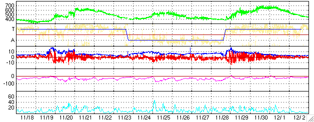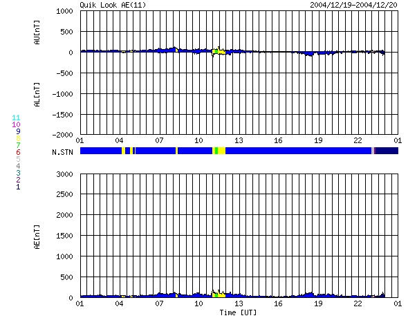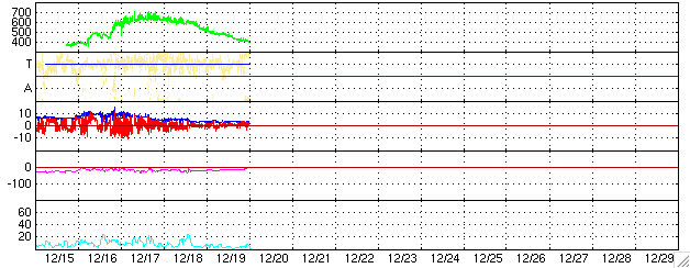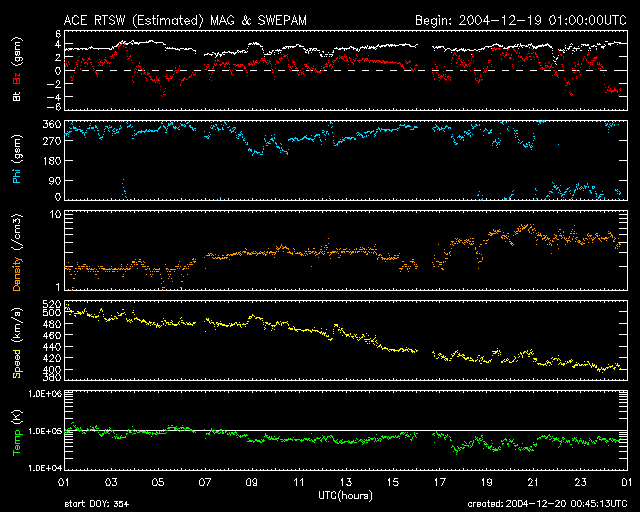 2004/12/20 09:46 更新 太陽風は通常レベル(400km/秒)にもどりました。磁気圏はとても穏やかです。 担当 篠原 ACE衛星の観測によると、太陽風の速度は順調に低下を続け、 通常の速度と言える400km/秒に戻りました。 磁場強度は3〜4nT程度と、こちらも普通の強さで安定しています。 このため、磁気圏のオーロラ活動はすっかり静かになっています。 オーロラの活動度を示すAE指数のグラフには全く変化が見られません。 SOHO EIT284カメラの観測休止状態が続いているため、最新の太陽画像が得られていません。 このため、27日前のデータから今後を予測すると、明日の21日くらいまでは穏やかな状態が続きそうです。 しかし、早ければ明日の夜ぐらいから太陽風磁場の強まりが始まり、 それに続いて太陽風速度の上昇が発生しそうです。 前周期では、最高速度は550km/秒くらいでした。 磁場が強く南を向いた時間帯もあって、オーロラ活動が活発にもなりました(11月25日)。 今周期も磁場の南向き成分の強まりに注意しつつ、速度の上昇に注目して下さい。 高速風の期間は短く、2日程度で終わりそうです。 高速太陽風に続いて良く見られる、放射線帯の高エネルギー電子密度の増加ですが、 今回は目立った増加には至っていません。 10の3乗を越えた程度で、警戒ライン(10の4乗の線)には届かない様に思われます。 太陽では、東寄りにある713黒点群がC1.8の小さな小規模フレアを起こしています。 今後も、穏やかな状態が続くでしょう。 ACEが観測した太陽風の磁場(1番上の枠、白線は全体の強度、赤線は南北成分) および、太陽風の密度(3番目の橙線)、速度(4番目の黄線) (c) NOAA/SEC ![]() リアルタイムAE指数 下段のAEグラフの値が高くなると、オーロラ活動が活発化しています。 (c) 京都大学, NICT ![]() 27日の太陽周期に合わせたデータプロット (太陽風版) 太陽が同じ面を地球に向けていた27日前の変化から、今後を予想することができます。 (c) NICT