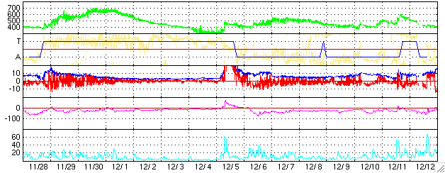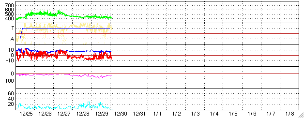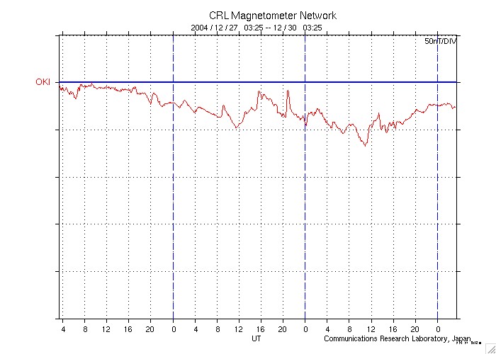 ACEが観測した太陽風の磁場(1番上の枠、白線は全体の強度、赤線は南北成分) および、太陽風の密度(3番目の橙線)、速度(4番目の黄線) (c) NOAA/SEC ![]() リアルタイムAE指数 下段のAEグラフの値が高くなると、オーロラ活動が活発化しています。 (c) 京都大学, NICT ![]() 沖縄の磁場擾乱 下へ下がるほど、擾乱が発達している事を意味します。 (c) NICT ![]() 27日の太陽周期に合わせたデータプロット (太陽風版) 太陽が同じ面を地球に向けていた27日前の変化から、今後を予想することができます。 (c) NICT