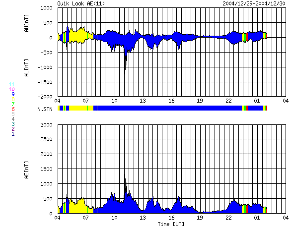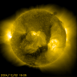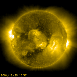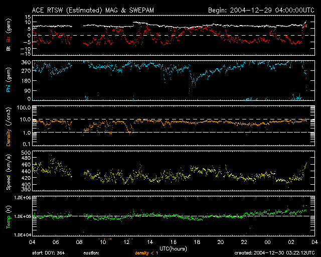 2004/12/30 12:23 更新 太陽風磁場の南向き傾向が続き、オーロラもやや活発に続いています。新しい黒点群が中規模フレアを起こしています。 担当 篠原 太陽風磁場の南向き傾向が続いています。 昨日の様な、安定した南向きではなくなりましたが、 -5nT程度のやや強い南向き成分が連続的に現れています。 現在の磁場強度は7nTほどで、南向き成分も-5nTが続いています。 太陽風の速度は通常レベルで、420km/秒を前後しています。 速度が速くはないために、大規模な擾乱には繋がっていませんが、 AE指数のグラフを見ると、 500nT程度のやや活発なオーロラ活動が連続的に観測されています。 太陽風磁場の南向き傾向が続く間は、今後もこの程度のオーロラ活動が継続するでしょう。 また、沖縄の磁場観測によると、 磁場のグラフが通常レベル(青い横線)から最大で50nTほど下がっていました。 弱い磁気嵐状態になっていた様です。 SOHO EIT284の太陽観測が回復しました。久しぶりの太陽画像をご覧下さい。 太陽の中心に大きく丸を描く様に、コロナホール(暗く見えている部分)が見えています。 27日前に太陽の同じ面が地球を向いていた時の画像を比較して下さい。 コロナホールが形はやや変わっていますが、ほぼ同じ位置に見えていることが分かります。 従って、太陽風の変化も27日前と似た傾向になりそうです。 27日前のデータでは、これから3日程穏やかな状態が続き、 その後太陽風の速度が500km/秒に上昇する変動が見られています。 (12月5日の変化は、突発性の現象によるもので、コロナホールとは関係ありません) さて、今周期はどのようになるでしょうか。 コロナホールの位置を考えると、早ければ1月1日から速度の上昇が始まるかもしれません。 太陽では、新しく見えて来た715黒点群が、 30日1時(世界時29日16時)にM2.3の中規模フレアを起こしています。 今後も中規模フレアへの注意が必要とのことです。 また、西に没しつつある713黒点群も、 30日4時(世界時29日19時)にM1.4の中規模フレアを起こしています。 713黒点群は、その他にも小規模フレアを頻繁に起こしていましたが、 太陽面の向こう側に行ってしまいましたので今後は影響ありません。 SOHO衛星のEIT284カメラの映像 (c) SOHO (ESA & NASA)
