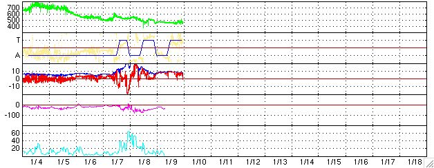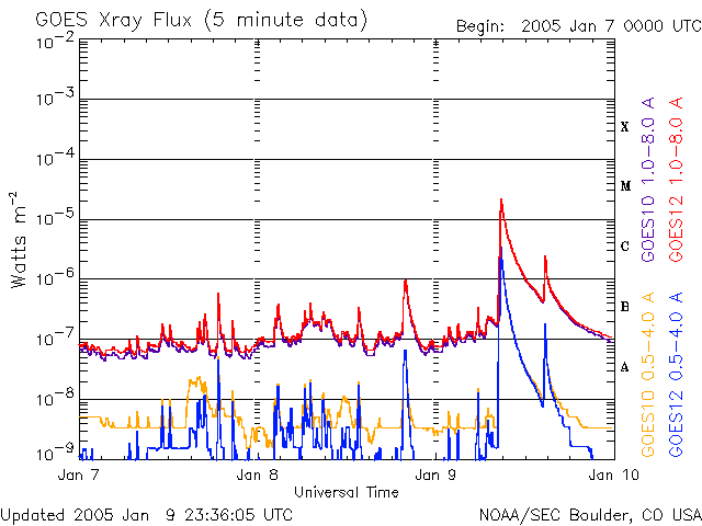 2005/ 1/ 9 12:29 太陽風の乱れは収まりました。11日までは穏やかな状態が続きそうです。