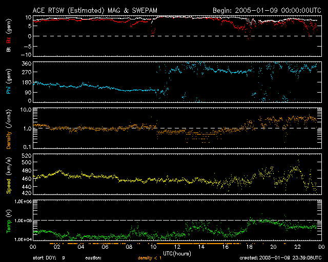 2005/ 1/ 8 09:29 CMEの影響で太陽風の磁場強度がとても強まっています。オーロラもとても活発になっています。