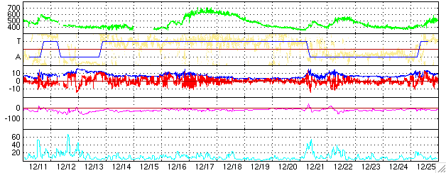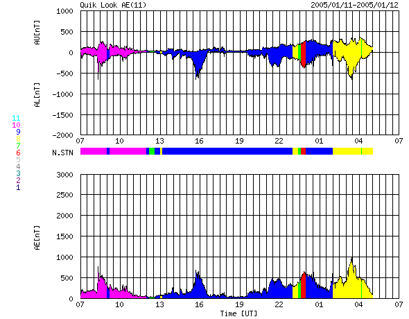 下段のAEグラフの値が高くなると、オーロラ活動が活発化しています。