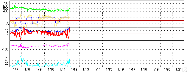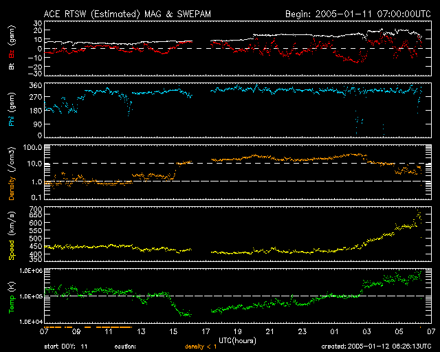 2005/ 1/11 09:03 太陽風は通常レベルで、磁気圏は概ね穏やかです。明日からコロナホールの影響が始まるでしょう。