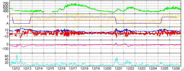 ACEが観測した太陽風の磁場(1番上の枠、白線は全体の強度、赤線は南北成分) および、太陽風の密度(3番目の橙線)、速度(4番目の黄線) (c) NOAA/SEC ![]() 27日の太陽周期に合わせたデータプロット (太陽風版) 太陽が同じ面を地球に向けていた27日前の変化から、今後を予想することができます。 (c) NICT