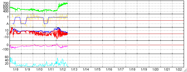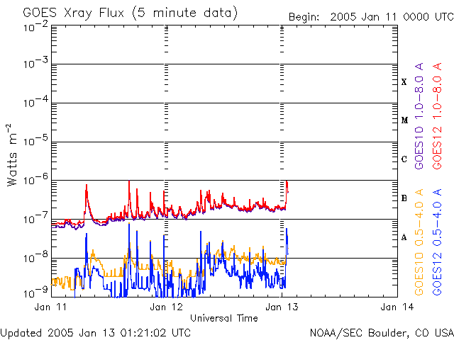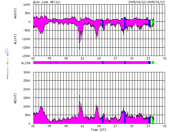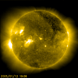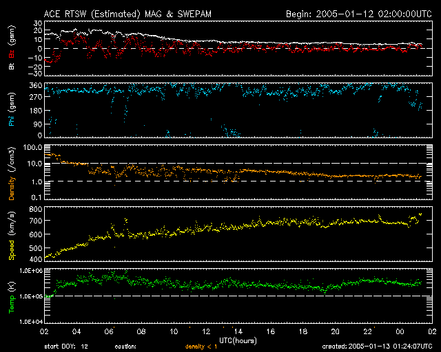 2005/ 1/13 10:24 更新 高速太陽風が続いています(700km/秒)。オーロラ活動もやや活発に続いています。 担当 篠原 太陽風の速度は更に上昇し、13日0時(世界時12日15時)頃に700km/秒に達しました。 高速風はその後も安定していて、とても速い状態が続いています。 一方、磁場強度は12日17時(世界時12日8時)頃から弱まり始め、現在は5nT程度に戻っています。 27日周期の図を参考にすると、半日程度変化の様子が早まっているように見えます。 太陽面のコロナホールの分布に変化があったためでしょう。 高速風は今日一杯は高い状態が続き、明日から緩やかに低下に向かうと思われます。 15日が終わる頃に通常レベルに戻っているのではないでしょうか。 高速風に刺激され、オーロラ活動が活発になっています。 オーロラの活動度を示すAE指数のグラフを見ると、500nT前後の活動がほぼ連続して観測されています。 また、1000〜1500nTに達する様な激しい変動も度々観測されており、 極域の空はオーロラでかなりにぎやかだったようです。 高速風は現在も続いていますが、磁場強度が次第に弱まっていますので、 今後は極端に激しい活動が見られることはないでしょう。 速度が高い間は、太陽風磁場が南を向いた時(ACEの赤線がマイナスに振れる)に合わせて、 活発なオーロラが見られます。 太陽面では、720黒点群が急速に規模を拡大しています。 画像でも目立つ大きさに成長しています。 しかし、フレア(太陽爆発)活動は穏やかです。 718群も含めて、目立った変化は観測されていません(GOES衛星のX線の図を参照)。 今の所は小規模フレアに対する注意で良さそうですが、720群の更なる発達には注意が必要でしょう。 SOHO衛星のEIT284カメラの映像 (c) SOHO (ESA & NASA)