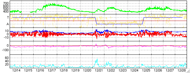 GOES衛星の太陽X線データ (c) NOAA/SEC ![]() SOHO衛星のMDIカメラによる太陽黒点 (c) SOHO (ESA & NASA) ![]() ACEが観測した太陽風の磁場(1番上の枠、白線は全体の強度、赤線は南北成分) および、太陽風の密度(3番目の橙線)、速度(4番目の黄線) (c) NOAA/SEC ![]() 27日の太陽周期に合わせたデータプロット (太陽風版) 太陽が同じ面を地球に向けていた27日前の変化から、今後を予想することができます。 (c) NICT