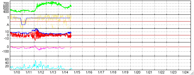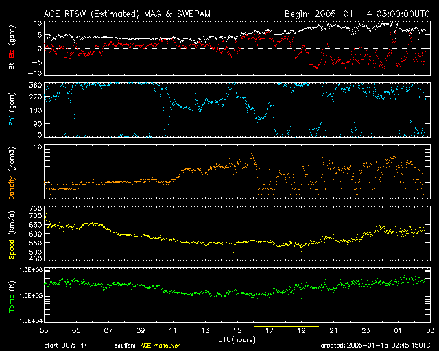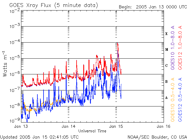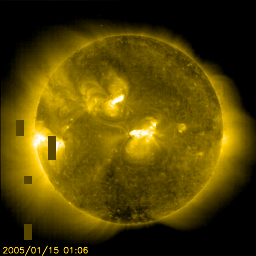 2005/ 1/15 11:45 更新 X1.3の大規模フレアが発生しました。太陽風は南向き磁場が強まって、オーロラが活発になっています。 担当 篠原 15日9時半(世界時15日0時半)に、X1.3の大規模フレア(太陽爆発)が発生しました。 発生箇所は、急激に規模を拡大していた720黒点群です。 昨日のニュース発行のやや前から、この720黒点群と南側に見える718黒点群は、 互いに競う様に激しく小・中規模のフレアを起こしていました。 Mクラスの中規模フレアだけで、5回程度起こしています。 こちらに14日の動画があります。 ちかちかと両者が美しく輝き合う様子をご覧下さい。 720、718群ともに引き続き活発な活動を続けると思われます。 今後も注意が必要です。 この大規模フレアに伴って、CME(太陽ガスの放出現象)が発生している可能性があります。 まだ発生直後でデータが揃っていませんので、詳細は明日お知らせします。 一方、太陽風ですが、コロナホールの影響が弱まって、速度が低下を始めていました。 650km/秒だった速度は緩やかに低下し、15日4時(世界時14日19時)頃に550km/秒まで下がりました。 しかし、その後再び速度の上昇が始まっています。現在は600km/秒まで戻しました。 これに先立って、太陽風磁場の強まりが観測されています。 ACEのデータでは5nTだった磁場強度が、10nT近くまで強まっています。 太陽風の速度上昇と関係している様です。 SOHO EIT284の太陽画像でははっきりしたコロナホールは見られず、原因は良く分かりません。 また、27日周期の図を見ても、前回にはこの様な変化は見られず、 太陽が一回転するあいだに新しくできた構造の様です。 強まった太陽風磁場が南寄りに推移しています。 このため、オーロラ活動が強まっています。 15日5時(世界時14日20時)以降、AE指数にして700nTの活発なオーロラが続いています。 現在の磁場状況が続く間は、オーロラも引き続き活発に続くでしょう。 放射線帯高エネルギー電子は、昨日まで高いレベルが続いていましたが、 太陽風の新たな乱れの影響で密度を減らした様です。 一旦、警戒ラインを切っていると思われます。 SOHO衛星のEIT284カメラの映像 (c) SOHO (ESA & NASA)