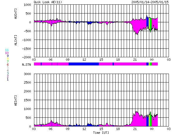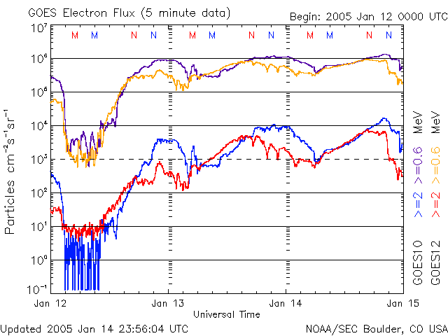 下段のAEグラフの値が高くなると、オーロラ活動が活発化しています。 (c) 京都大学, NICT ![]() GOES衛星による、静止衛星軌道における高エネルギー電子の変化 (c) NOAA/SEC ![]() | ||||||||||||||||||||||||||||||||||||||||||||||||||||||||
