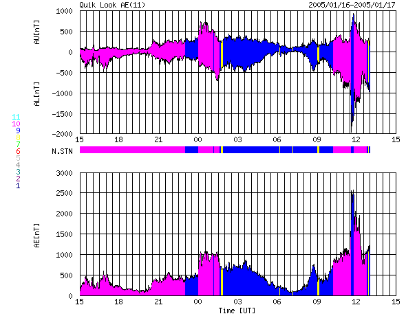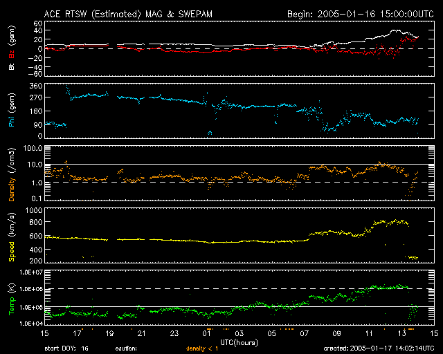 2005/ 1/17 23:01 更新 太陽風が一段と高速になり、オーロラが非常に活発になっています。また、X4.2の非常に大きなフレアが発生しました。 担当 篠原 先ほどの速報で、太陽風衝撃波の第一報をお知らせしましたが、 その後、太陽風の速度が更に上昇して磁場強度も強まり、オーロラが非常に活発になっています。 ACE衛星の観測によると、17日16時(世界時17日7時)に最初の太陽風速度の上昇が発生し、 500km/秒だった太陽風は650km/秒に上昇しました。 そして、17日20時(世界時17日11時)に更にもう一段速度の上昇が起こり、 現在は800km/秒ととても高速になっています。 一方、磁場強度も非常に強まっています。 太陽風の最初の変化では10nTを超える程度にしか強まりませんでしたが、 その後ぐんぐん増加を続け、最大で40nTと非常に強まりました。 現在はやや下がって30nTになっています。 磁気圏擾乱のスイッチとも言える、太陽風磁場の南向き成分ですが(ACEデータの赤線のマイナス成分)、 -10nT前後の大きな成分が現れています。 このため、オーロラが非常に活発になっています。 AE指数のグラフを見ると、最大2500nTという猛烈な値を記録しています。 磁気嵐としても発達を始めている様で、沖縄の磁場変化を見ると、 最大で-80nT程度の静穏レベル(青い横線)からの減少が観測されています(減るほど、磁気嵐が発達しています)。 太陽風の磁場は、17日22時(世界時17日13時)から北向きに変わりました。 このため、オーロラ活動はこの後一旦収束しそうです。 しかし、南北成分はこの後、ゆっくりと再び南向きに反転していく可能性があります。 速度が非常に高いレベルを保ち続けていた場合は、再び激しいオーロラ活動、磁気嵐が発生するでしょう。 また、これから明日の午前中にかけて、X2.6の大規模フレアに伴う次の衝撃波が到来すると予想されます。 太陽風の乱れが更に強まる可能性があります。 (今回の2段目の増速が、このフレアに相当している可能性もあります) 720黒点群は依然大規模なエネルギーを蓄えていたようです。 17日18時(世界時17日9時)にこの群として最大のX4.2の非常に大きなフレアを発生させました。 この影響で、太陽放射線が更に増加を始めています。 現在500PFUを越えて、更に上昇する様子です。 衛星の運用では注意が必要でしょう。 GOES衛星が観測したX4.2の太陽フレア。17日19時(世界時17日10時)。 (c) NOAA/SEC ![]() ACEが観測した太陽風の磁場(1番上の枠、白線は全体の強度、赤線は南北成分) および、太陽風の密度(3番目の橙線)、速度(4番目の黄線) (c) NOAA/SEC ![]() リアルタイムAE指数 下段のAEグラフの値が高くなると、オーロラ活動が活発化しています。 (c) 京都大学, NICT ![]() 沖縄の磁場擾乱 下へ下がるほど、擾乱が発達している事を意味します。 (c) NICT ![]() GOES衛星の太陽X線データ (c) NOAA/SEC ![]() SOHO衛星のMDIカメラによる太陽黒点 (c) SOHO (ESA & NASA) ![]() GOES衛星の太陽放射線データ (c) NOAA/SEC ![]() | |||||||||||||||||||||||||||||||||||||||