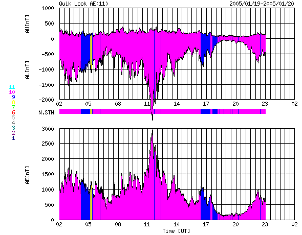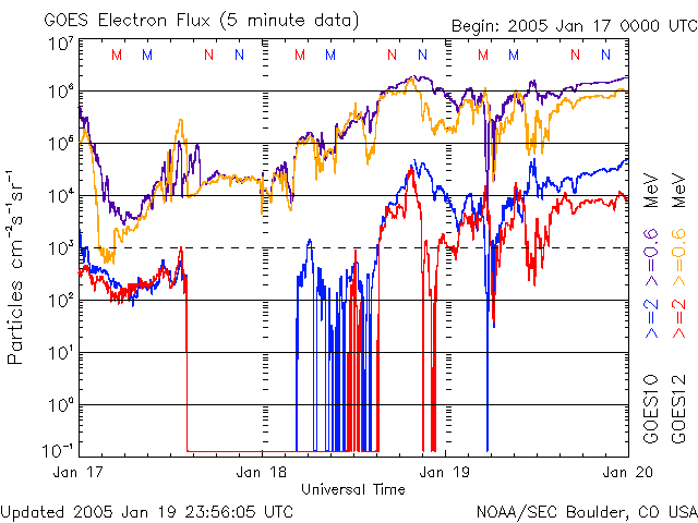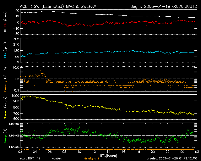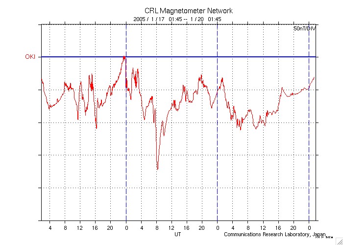 ACEが観測した太陽風の磁場(1番上の枠、白線は全体の強度、赤線は南北成分) および、太陽風の密度(3番目の橙線)、速度(4番目の黄線) (c) NOAA/SEC ![]() リアルタイムAE指数 下段のAEグラフの値が高くなると、オーロラ活動が活発化しています。 (c) 京都大学, NICT ![]() 沖縄の磁場擾乱 下へ下がるほど、擾乱が発達している事を意味します。 (c) NICT ![]() GOES衛星の太陽X線データ (c) NOAA/SEC ![]() SOHO衛星のMDIカメラによる太陽黒点 (c) SOHO (ESA & NASA) ![]() GOES衛星の太陽放射線データ (c) NOAA/SEC ![]() GOES衛星による、静止衛星軌道における高エネルギー電子の変化 (c) NOAA/SEC ![]() | ||||||||||||||||||||||||||||||||||||||||