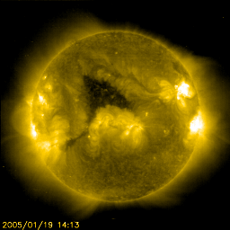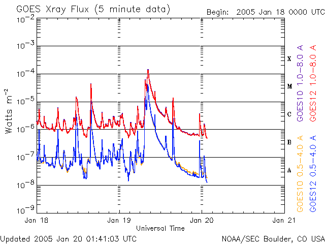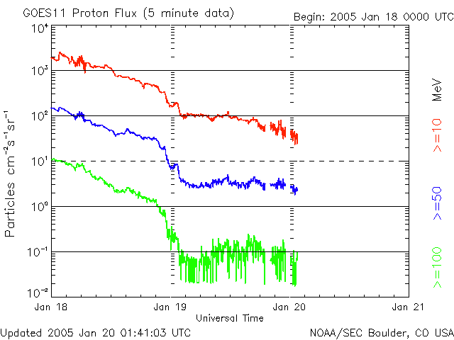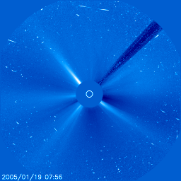 2005/ 1/20 10:43 更新 太陽風は現在もとても高速(700km/秒)です。オーロラ活動も活発です。放射線帯の高エネルギー電子が増加しています。 担当 篠原 /// とても長文になっています。図を別に開いて、比較しながら本文をお読み下さい。 /// また、動画を3点掲載しています。 昨夜のニュースで、太陽風磁場の変化によって磁気圏活動が更に活発化する可能性を記しましたが、 太陽風磁場が大きく南を向く事はありませんでした。 ACE衛星の観測によると、 太陽風磁場は19日17時(世界時19日8時)から19日23時(世界時19日14時)にかけて -5nTの南向きが継続し、その後も小さいもののやや南向き傾向で推移しました。 その間、太陽風の速度も800km/秒前後と大変高速だったため、磁気圏に強くエネルギーが流入し、 非常に激しいオーロラ活動が発生しました。 AE指数のグラフを見ると、1500nTから最大で3000nTに達する猛烈な変化が観測されています。 一方、強く南を向く事は無かったため、大規模な磁気嵐の発達は起こりませんでした。 沖縄の磁場変化を見ると、最大で-110nTの減少と普通の規模の磁気嵐に留まっています。 (赤線が青の横線から下がるほど、磁気嵐が発達したことを示します) 現在の太陽風は、速度が緩やかに低下を続け、700km/秒にまで下がりました。 それでも、とても高速な状態です。 太陽風磁場の強度は約8nT。 最新の部分では北向きになっていますので(ACEデータの赤線がプラスになっている)、 一旦オーロラ活動は低下しそうです(北向きになると、エネルギーの流入が止まる)。 しかし、磁場の方向が再び南寄りに変わると(ACEデータの赤線がマイナスになる)、 高速風が続いている間はオーロラ活動も活発になります。 太陽風の速度が下がりきるまでは(500km/秒を切るまで)、注意が必要です。 さて、今日のニュースの最初の部分で、動画を3枚紹介しています。 1枚目は、今回の主役である720黒点群の発達の様子です。 太陽面のこちら側で急激に発達した様子が良く分かります。 720黒点群は依然大きな規模を保っています。 2枚目は、GOES衛星のX線カメラによる17日18時(世界時17日9時)のX3.8の太陽フレア(太陽爆発)です。 今回の最大のフレア活動です。 3枚目は昨日観測されたX1.5の大規模フレアに伴うCME(太陽ガスの放出現象)です。 720黒点群は昨日、19日17時(世界時19日8時)にもX1.5の大規模フレアを発生させました。 これに伴って観測されたCMEの様子です。 720黒点群は太陽の中心を過ぎ、既に西に傾いています。 このため、放出されたガスも大半は西に飛び出しています。 地球への影響はほとんど見られないのではないでしょうか。 太陽風に変化があるとすると、明日の午後から深夜にかけてと予想されます。 このフレアによる太陽放射線の増加はほとんど観測されませんでした。 ただ、ここまでの放射線レベルが高かったたので、変化が埋もれてしまったのかもしれません。 一方、磁気圏内の放射線帯高エネルギー電子の密度が急増しています。 GOES10、GOES12衛星の観測によると、両衛星とも警戒レベルと言われる10の4乗の線を越えています。 高速風が続いていますので、今後更に増加する可能性があります。 衛星の運用では、引き続きこちらへの警戒が必要になるでしょう。 最後に、この数日CMEによる太陽風擾乱が続いていますが、 その間にコロナホールが太陽面のほぼ中心にやってきました。 SOHO EIT284の太陽画像をご覧下さい。 23日頃からこのコロナホールの影響で太陽風の速度が上昇する可能性があります。 SOHO MDIカメラが捉えた720太陽黒点群の発達の様子。1月10日〜19日。 (c) ESA & NASA ![]() GOES衛星のX線カメラが観測した、17日18時(世界時17日9時)のX3.8の太陽フレアの動画。 (c) NOAA/SEC ![]() SOHO LASCO C3カメラが捉えた、19日18時(世界時19日9時)のCME(太陽ガスの放出現象)。 (c) ESA & NASA ![]() SOHO衛星のEIT284カメラの映像 (c) SOHO (ESA & NASA)