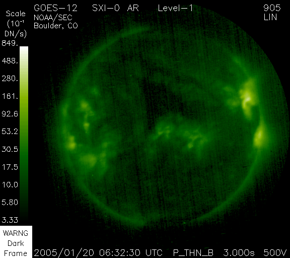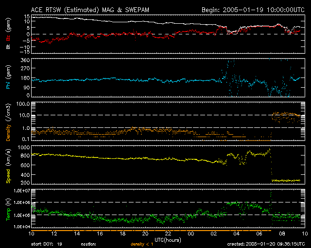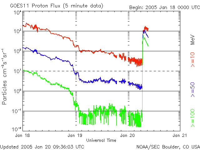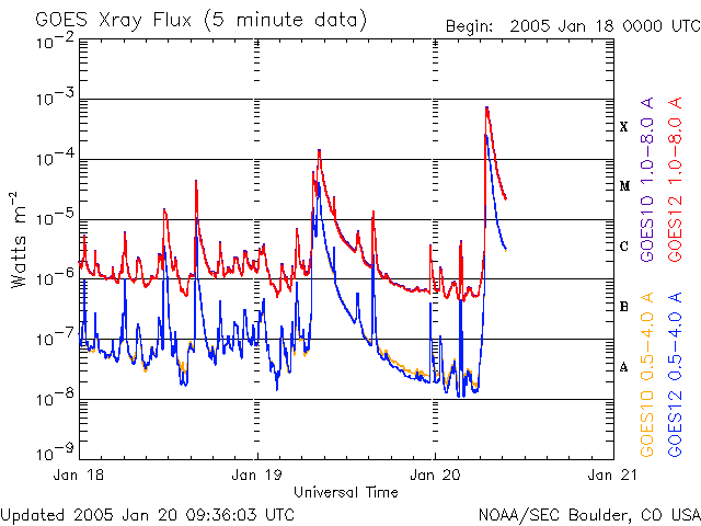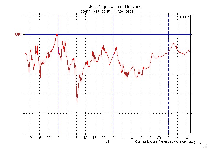 2005/ 1/20 18:36 更新 X7.1の非常に大きなフレアが発生しました。太陽放射線の強度が再び急増しています。オーロラの活動は穏やかになっています。 担当 篠原 今日2回目の更新です。 ここでは、今日発生したX7.1の大規模フレアを中心に述べます。 今朝のニュースで、ここまでの擾乱について詳しく記していますので、こちらもご覧下さい。 今日の昼過ぎ、20日15時(世界時20日6時)にX7.1の非常に大規模なフレア(太陽爆発)が発生しました。 発生箇所は720黒点群で、この黒点群が起こしたフレアとしては最大の規模になります。 これまで次々と起こした大規模フレアでかなり疲弊しているのではないかと想像していましたが、 720黒点群はいまなお非常に大きなエネルギーを蓄えていた様です。 このフレアによって、太陽放射線(太陽方向から飛来する高エネルギーのプロトン粒子)が 再び非常に高いレベルに戻っています。 現在1000PFUを越えた状態に達しています。 衛星の運用においては十分な注意が必要でしょう。 Xフレアの様子を、GOES衛星のX線カメラの画像で掲載しています。 爆発の直後から、太陽放射線による雪の様な白い光が舞い込んでいます。 "Snowstorm" 吹雪と呼ばれている様です。 この太陽放射線の影響で、太陽風データの観測に支障が発生しています。 ACE衛星の太陽風の速度データが観測不能になっており、300km/秒前後の低速状態になっています。 これは正しい値ではありませんので注意して下さい。 太陽風速度は、20日12時(世界時20日3時)頃から、800km/秒に急に上昇する変化が発生していました。 度重なる太陽爆発で、かなり複雑な太陽風構造になっているようです。 太陽風磁場は今日はずっと北寄り(ACEの赤線がプラスになっている)が続いています。 このため、オーロラ活動は穏やかになっています。 ただし、太陽風は依然高速ですので、磁場の変化によって再び活発になる可能性があります。 南北成分の変化に注目して、注意を続けて下さい。 GOES衛星が観測したX7.1の大規模太陽フレア。19日17:4020日15時(世界時20日6時)。 (c) NOAA/SEC ![]() GOES衛星の太陽X線データ (c) NOAA/SEC ![]() SOHO衛星のMDIカメラによる太陽黒点 (c) SOHO (ESA & NASA) ![]() GOES衛星の太陽放射線データ (c) NOAA/SEC ![]() ACEが観測した太陽風の磁場(1番上の枠、白線は全体の強度、赤線は南北成分) および、太陽風の密度(3番目の橙線)、速度(4番目の黄線) (c) NOAA/SEC ![]() リアルタイムAE指数 下段のAEグラフの値が高くなると、オーロラ活動が活発化しています。 (c) 京都大学, NICT ![]() 沖縄の磁場擾乱 下へ下がるほど、擾乱が発達している事を意味します。 (c) NICT ![]() | |||||||||||||||||||||||||||||||||||||||