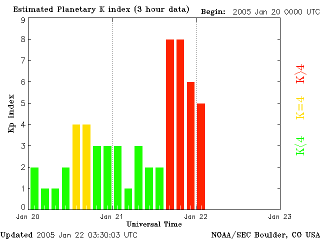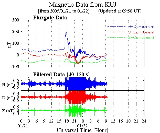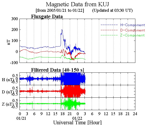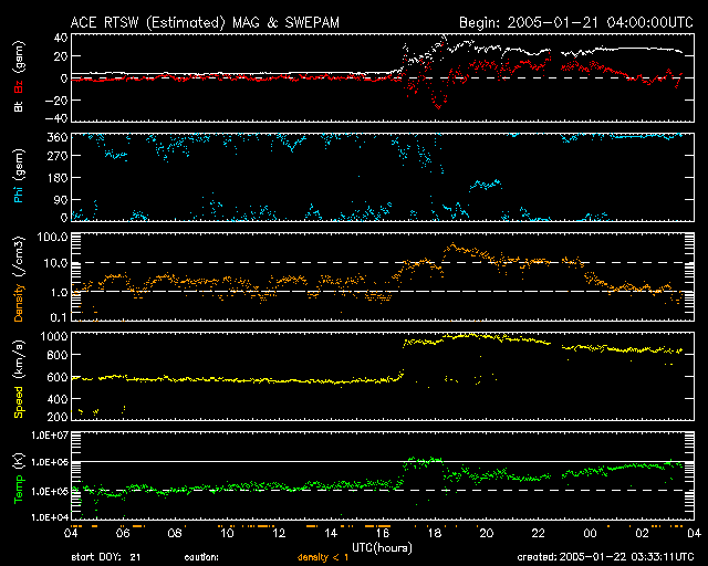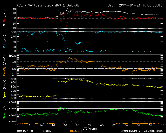 2005/ 1/22 13:00 更新 太陽風の衝撃波が到来し、大規模な磁気嵐が発達しています。太陽風はとても乱れており、磁気嵐が更に発達した場合、低緯度オーロラが発生する可能性があります。 2005/ 1/22 19:00 追加 太陽風磁場の南向きはほとんど強まらず、磁気嵐の発達は起きていません。太陽風は依然高速です(770km/秒)。 担当 篠原 昨夜、22日2時(世界時21日22時)に太陽風の衝撃波が地球に届きました。 太陽風の速度は600km/秒から950km/秒に急上昇し、 磁場強度も約30nT(最高40nT)に強まっています。 どちらも非常に高い値です。 特に太陽風の磁場が衝撃波の先頭部分で大きく南を向いていました (ACEデータの赤線がマイナスを向いている)。 南向きは最大で-30nTにも達しています。 このため、地球磁気圏は非常に大きな影響を受けています。 九州大学宙空環境研究所の久住観測データを参考にすると、 衝撃波到来時に現れるscと呼ばれる磁場強度の増加現象の振幅が、 150nTと非常に大きくなっています。 その後磁場強度は急激に低下し、磁気嵐が発達した事を示しています。 磁気嵐の強さはこの時点で最大で-230nTにも達しています。 その後は、やや安定した状態を保っています。 今回の衝撃波は、20日15時半(世界時20日6時半)に発生した、 X7.1の非常に大きなフレア(太陽爆発)によるものです。 発生源の720黒点群の位置は既に西に傾いていたため、 放出されたガスの中心は太陽の西方向に向かっていたと思われます。 従って、地球へ届いたのはそのガスの周辺部だったはずです。 それでもなおこれだけの太陽風擾乱を起こしていますので、 太陽爆発がいかに巨大なものだったかというのが良く分かります。 発生が数日早まっていて、地球の正面に位置していた場合は、 現状を遥かに凌ぐ、猛烈な擾乱が発生していた可能性があります。 この週末、定期点検のためNICTが停電になっており、 参照できる最新データが限られており、状況の把握がやや困難になっています。 GOES衛星による磁場観測のデータをご覧下さい。 図の中心付近の激しく変化している部分にマイナスに飛び出している時間帯があります。 最大で-150nTに達していますが、 これは太陽風の影響で磁気圏が次々にはぎ取られ、 静止衛星が磁気圏の外側へ飛び出してしまった事を示しています。 それほど激しい太陽風の乱れだったのです。 また、米国のNOAA/SECが発表しているK指数(磁気圏の乱れの度合いを示す)予測値の図をご覧下さい。 衝撃波が到来した後、赤のグラフが連続しています。 オーロラ活動が活発化し、磁気圏が非常に激しく乱れている事を示唆しています。 さて、ACE衛星の太陽風データを見ると、 現在も速度が800km/秒と非常に高速で、磁場強度も20nT強と大変強い状態が続いています。 現在、磁場の南北成分がほぼ0付近にありますが、 この値が南向きになると、磁気圏の乱れは更に活発になります。 磁場強度が大きいため、南向きも大変強くなる可能性があります。 その場合は、磁気嵐も一層強まるでしょう。 高速風が続いている間は、注意が必要です。 今後大きく南を向いて、磁気嵐が更に発達した場合、 北海道などで低緯度オーロラが観測される可能性があります。 ただし、今日は月が満月にかなり近く、月明かりが観測を邪魔しそうです。 2005/ 1/22 19:00 追加 (篠原) 関連の図はページの最後にあります 太陽風の磁場はその後も0付近を変化していて、大きな南向き成分は現れていません。 このため、磁気嵐の大きな発達は起きていません。 九州大学宙空環境研究所の久住観測データによると、 磁場強度は回復に向かっている様です(青線が上昇している)。 太陽風の擾乱は次第に弱まっています。 現在、速度は770km/秒、磁場強度は15nT程度です。 しかし、数値としてはどちらも依然乱れた状態です。引き続き注意が必要です。 太陽風磁場が大きく南を向いた場合は、再び活発な活動が始まるでしょう。 今回の擾乱に続いて、コロナホールの影響が明日から始まると思われます。 太陽風はある程度の高速状態で安定し、数日間継続すると予想されます。 一方、太陽放射線はすっかり低下して、20PFUにまで下がっています。 ACEが観測した太陽風の磁場(1番上の枠、白線は全体の強度、赤線は南北成分) および、太陽風の密度(3番目の橙線)、速度(4番目の黄線) (c) NOAA/SEC ![]() 久住の磁場データによる、静止衛星軌道における磁場の変化 青い線が下へ下がるほど、磁気嵐が発達している事を示しています (c) 九州大学/SERC ![]() GOES衛星による、静止衛星軌道における磁場の変化 (c) NOAA/SEC ![]() NOAA/SECによる、K指数(磁気圏の乱れの度合いを示す)予測値 (c) NOAA/SEC ![]() 2005/ 1/22 19:00 追加 ACEが観測した太陽風の磁場(1番上の枠、白線は全体の強度、赤線は南北成分) および、太陽風の密度(3番目の橙線)、速度(4番目の黄線) (c) NOAA/SEC ![]() 久住の磁場データによる、静止衛星軌道における磁場の変化 青い線が下へ下がるほど、磁気嵐が発達している事を示しています (c) 九州大学/SERC 