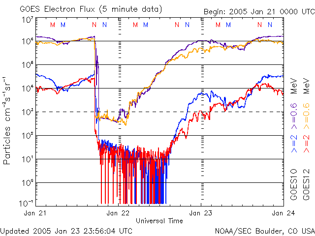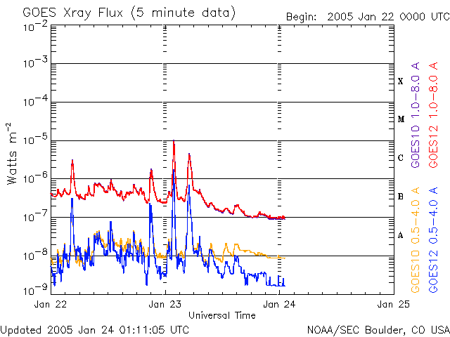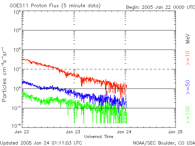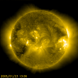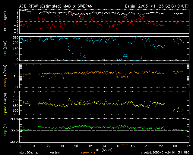 2005/ 1/24 10:13 更新 コロナホールによる高速太陽風が続いています(600km/秒)。放射線帯の高エネルギー電子が増加しています。 担当 篠原 720黒点群は太陽の西の端から没して行きました。 今日の太陽画像では、既にその姿を見る事はできません。 現在の太陽面には3つの群の番号が付けられています。 いずれも活動は穏やかです。 X線のグラフにある最後の2つのフレアも、没した720黒点群で発生したものです。 ずっと高いレベルが続いていた太陽放射線ですが、一連の活動も終わり、 1PFUレベルにまで下がっています。 もう一桁下がって、0.1PFUになれば通常のレベルです。 太陽風は、CMEの影響に続いてコロナホールの高速風領域に入った様です。 現在は600km/秒です。 太陽風磁場は強度が4nT、南北に小さく振動するような変化を見せています。 このため、オーロラ活動は500nT程度の小規模な活動が度々現れています。 高速風はもう1〜2日程続きそうです。 磁場強度が下がっていますので、小規模なオーロラ活動が見られる程度でしょう。 一方、放射線帯の高エネルギー電子の密度が急増しています。 GOES 10, 12の両衛星で警戒ラインの10の4乗を越えています。 このレベルを越えると、衛星の運用では注意が必要と言われています。 高密度状態は数日に渡って続くと予想されます。 SOHO衛星のEIT284カメラの映像 (c) SOHO (ESA & NASA)