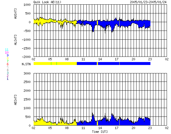 SOHO衛星のMDIカメラによる太陽黒点 (c) SOHO (ESA & NASA) ![]() GOES衛星の太陽X線データ (c) NOAA/SEC ![]() GOES衛星の太陽放射線データ (c) NOAA/SEC ![]() ACEが観測した太陽風の磁場(1番上の枠、白線は全体の強度、赤線は南北成分) および、太陽風の密度(3番目の橙線)、速度(4番目の黄線) (c) NOAA/SEC ![]() リアルタイムAE指数 下段のAEグラフの値が高くなると、オーロラ活動が活発化しています。 (c) 京都大学, NICT ![]() GOES衛星による、静止衛星軌道における高エネルギー電子の変化 (c) NOAA/SEC ![]() | ||||||||||||||||||||||||||||||||||||||||