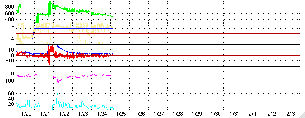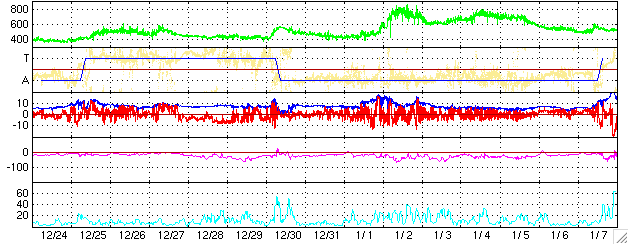 ACEが観測した太陽風の磁場(1番上の枠、白線は全体の強度、赤線は南北成分) および、太陽風の密度(3番目の橙線)、速度(4番目の黄線) (c) NOAA/SEC ![]() リアルタイムAE指数 下段のAEグラフの値が高くなると、オーロラ活動が活発化しています。 (c) 京都大学, NICT ![]() 27日の太陽周期に合わせたデータプロット (太陽風版) 太陽が同じ面を地球に向けていた27日前の変化から、今後を予想することができます。 (c) NICT
