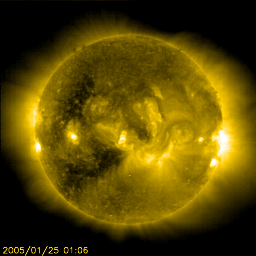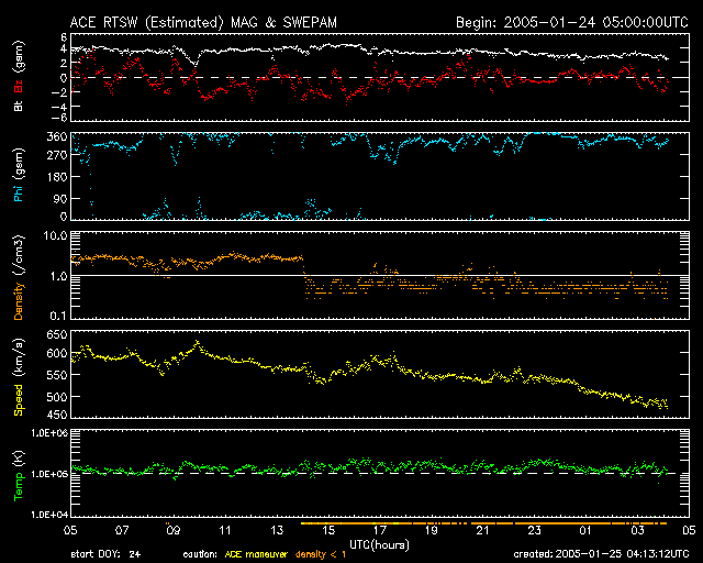 2005/ 1/25 13:13 更新 放射線帯電子は現在も高いレベルが続いています。太陽風の速度は下がりつつあります。 担当 篠原 太陽風の速度は緩やかに低下を始めました。 現在は500km/秒を切る程度にまで下がっています。 コロナホールの影響を抜けつつある様です。 速度は更に低下して、静穏レベル(400km/秒程度)へと戻って行くでしょう。 太陽風の磁場強度は4nTで、小さな振幅ですが南向きになる時間が頻繁に現れています。 このため、小規模ですがオーロラ活動が度々見られています。 AE指数のグラフでは500nT程度の活動が観測されています。 今後は速度の低下により、オーロラ活動は穏やかになって行くでしょう。 コロナホールの影響を抜けたので、太陽風はしばらく静かになりそうです。 そして、3日後ころから次のコロナホールの影響が及び始めると予想されます。 SOHO EIT284の太陽画像をご覧下さい。 太陽面の東側(左半分)が広くコロナホールに覆われている様子が見えています。 この先端(右端)が太陽の中心部に達していますので、3日後の28日頃から太陽風の乱れが始まりそうです。 参考に27日周期の図をご覧下さい。 前周期では1月1日から太陽風の乱れ(磁場強度の上昇、速度の上昇)が始まっています。 これは今周期では1月28日に相当します。 オーロラが活発になったり、弱い磁気嵐状態に発達するかもしれません。 放射線帯の高エネルギー電子密度は現在も高い状態が続いています。 GOES10, 12の両衛星で警戒レベルの10の4乗を完全に越えています。 オーロラ活動がこれから穏やかになると予想されますので、 高エネルギー電子の減少はゆっくりとしたものになるでしょう。 数日間に渡って高レベル状態が続くと予想されます。 太陽のフレア活動は穏やかになっています。 黒点写真を見ると、太陽面の東寄り(左寄り)に小さなまだ番号の付いていない黒点群が見えます。 727黒点群とのことですが、ここが小規模な活動をしている様です。 小規模フレアが発生するかもしれません。 SOHO衛星のEIT284カメラの映像 (c) SOHO (ESA & NASA)