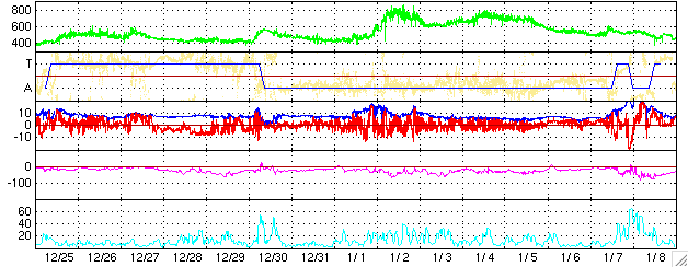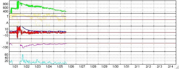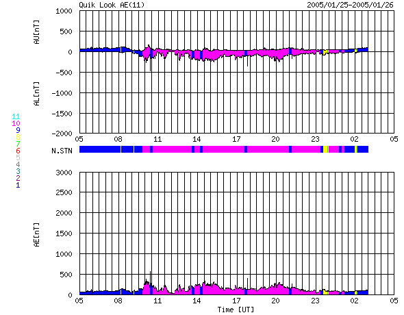ACEが観測した太陽風の磁場(1番上の枠、白線は全体の強度、赤線は南北成分) および、太陽風の密度(3番目の橙線)、速度(4番目の黄線) (c) NOAA/SEC ![]() リアルタイムAE指数 下段のAEグラフの値が高くなると、オーロラ活動が活発化しています。 (c) 京都大学, NICT ![]() 27日の太陽周期に合わせたデータプロット (太陽風版) 太陽が同じ面を地球に向けていた27日前の変化から、今後を予想することができます。 (c) NICT