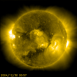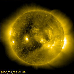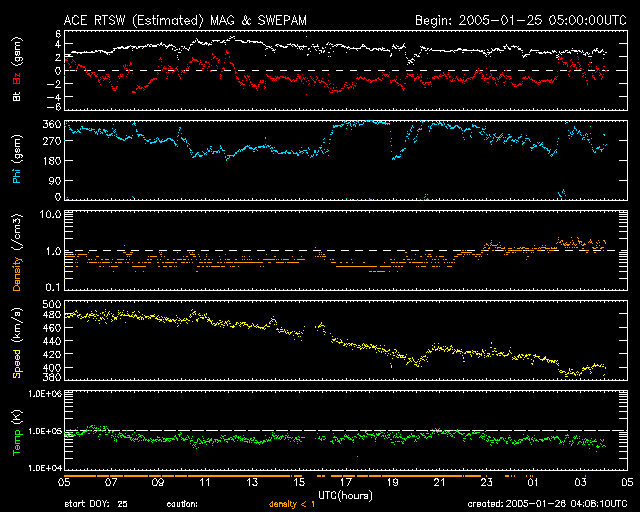 2005/ 1/26 13:08 更新 太陽風の速度が静穏レベルに戻りました。放射線帯電子は現在も高レベルです。 担当 篠原 太陽風の速度は引き続き緩やかに低下を続け、400km/秒と静穏レベルまで下がりました。 磁場強度も弱まり、2〜3nTに下がっています。 このためオーロラ活動もすっかり穏やかになっています。 AE指数のグラフを見ると、小さな変動が見られているだけです。 この変動は、太陽風の磁場が弱いながらも南向き成分(ACEの赤線がマイナスになる)を 持っているためと思われます。 太陽風はあと2日ほど穏やかな状態が続くでしょう。 その後、コロナホールの影響で速度が再び高くなり、 オーロラ活動が活発になると予想されます。 SOHO EIT284の太陽画像をご覧下さい。 太陽の中心から左側にかけて、黒くコロナホールが広がっているのが良く分かります。 27日前の前周期の写真を並べています。 比較すると、前周期以上に勢力が強まっているように見えます。 27日周期の図を参考にすると、前周期は速度は最高で800km/秒近くにまで上がり、 高速風は5日間程度続きました。 特に初めの3日ほどは太陽風磁場も大きく乱れ、オーロラ活動を活発にしています。 今周期はどうなるでしょうか。 擾乱は明後日の28日か29日頃から始まると予想されます。 放射線帯の高エネルギー電子は現在も高いレベルを保っています。 衛星の運用では引き続き注意が必要でしょう。 太陽のフレア活動は穏やかです。 黒点群は小さなものばかりです。 727群が小規模フレアを起こす可能性があるとのことです。 SOHO衛星のEIT284カメラの映像 (c) SOHO (ESA & NASA)