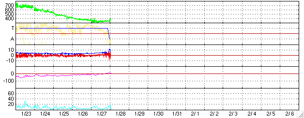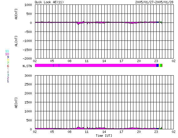 ACEが観測した太陽風の磁場(1番上の枠、白線は全体の強度、赤線は南北成分) および、太陽風の密度(3番目の橙線)、速度(4番目の黄線) (c) NOAA/SEC ![]() リアルタイムAE指数 下段のAEグラフの値が高くなると、オーロラ活動が活発化しています。 (c) 京都大学, NICT ![]() 27日の太陽周期に合わせたデータプロット (太陽風版) 太陽が同じ面を地球に向けていた27日前の変化から、今後を予想することができます。 (c) NICT