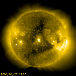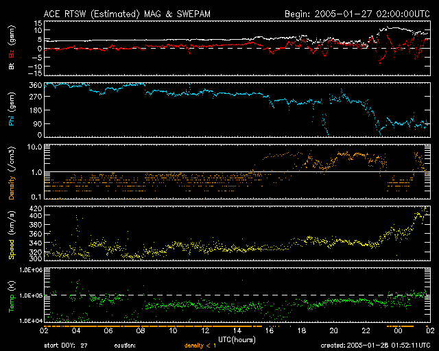 2005/ 1/28 10:52 更新 セクター境界の切り変わりで太陽風が乱れています。このまま高速風域に入ってオーロラ活動を強めるかもしれません。 担当 篠原 太陽風磁場のセクター境界に達した様です。 ACE衛星の太陽風データを見ると、磁場強度(白線)が28日0時(世界時27日15時)頃から乱れ始め、 それとともに磁場の方向(水色線)が大きく変化しています。 これは、太陽風の磁場の大まかな方向が、 「地球から太陽方向」から「太陽から地球方向」に切り替わる動きです。 変化とともに、太陽風磁場の南北成分(赤線)にも乱れが発生しましたが、 太陽風の速度が340km/秒程度ととても遅かったため、オーロラ活動には繋がりませんでした。 AE指数のグラフを見ると、全く変化が観測されていません。 その後、28日8時(世界時27日23時)頃から、太陽風の変化が新たな段階に入った可能性があります。 磁場強度が10nTに一気に強まり、速度が400km/秒に高まっています(これで通常の速度ですが)。 SOHO EIT284カメラの太陽画像に見られる様に、 これからコロナホール(太陽面中心付近に黒く見えている領域)による高速太陽風が 地球に影響を及ぼすと予想されています。 高速風領域への移行が見え始めているのかもしれません。 コロナホールによる擾乱では、高速風帯に入る時に磁場が大きく乱れ、 結果としてオーロラ活動を激しくすることが多く見られます。 太陽風のこれからの変化と、オーロラ活動に注目して下さい。 今の変化が高速風の入り口でなかったとしても、明日には高速風が始まると予想されます。 今日のアラスカは快晴の様です。 月が大きいのが残念ですが、ライブカメラでオーロラが楽しめるかもしれません。 放射線帯の高エネルギー電子は現在も高レベルが続いています。 しかし、今日の太陽風の乱れの影響で、減少の傾向が見えています。 今後オーロラ活動が強まる事になれば、一気に低下するでしょう。 まだしばらく注意が必要です。 太陽面はとても静かです。 SOHO衛星のEIT284カメラの映像 (c) SOHO (ESA & NASA)