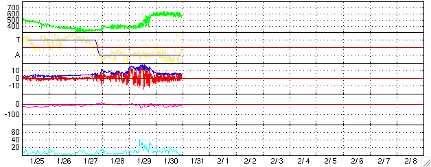 ACEが観測した太陽風の磁場(1番上の枠、白線は全体の強度、赤線は南北成分) および、太陽風の密度(3番目の橙線)、速度(4番目の黄線) (c) NOAA/SEC ![]() リアルタイムAE指数 下段のAEグラフの値が高くなると、オーロラ活動が活発化しています。 (c) 京都大学, NICT ![]() 27日の太陽周期に合わせたデータプロット (太陽風版) 太陽が同じ面を地球に向けていた27日前の変化から、今後を予想することができます。 (c) NICT